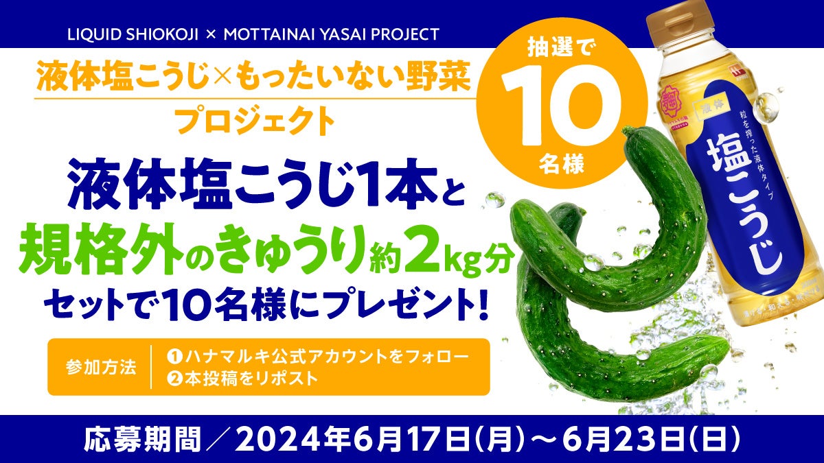 応 募 方 法:ハナマルキ公式 X のフォロー&キャンペーンの投稿をリポストした方の中から抽選で、10 名様に「ハナマルキ・液体塩こうじ 1 本」と「イオンアグリ・規格外のきゅうり 約 2 キロ分」のセットをプレゼントします。