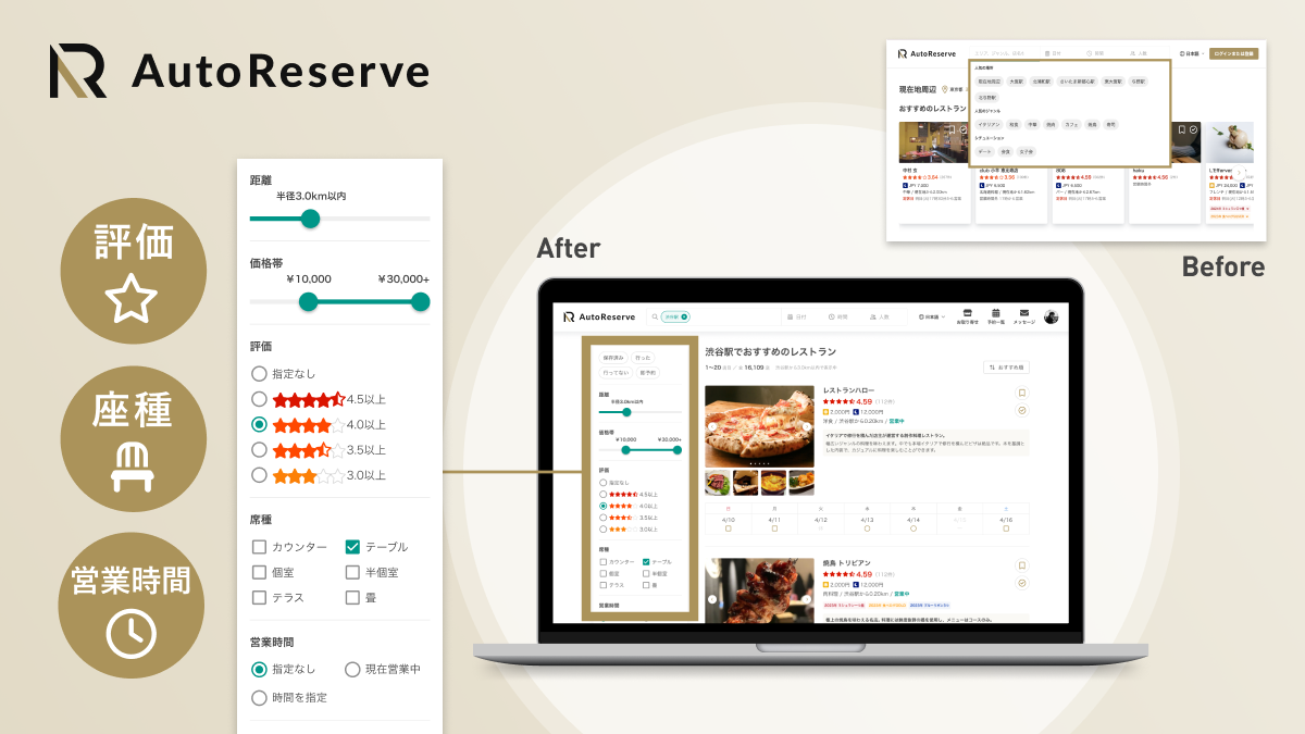 AutoReserveは日本国内および海外のレストラン予約をAIが行うサービス。予約可能なレストラン数は200万以上。店舗の営業時間外でもAutoReserveから行きたいお店を探し、オンラインから予約が可能です。移動中や会議中、お店の営業時間外、外国語話者による予約でもAIが調整して予約します。