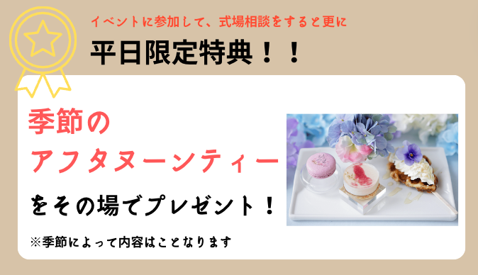 平日予約限定特典で季節のプチアフタヌーンティープレゼント!大人気特典スタートドレスフォトも!