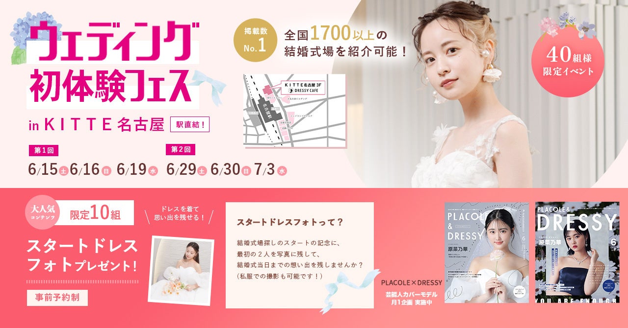 名古屋駅直結、JPタワー「KITTE名古屋」3F、PLACOLE&DRESSY(プラコレ&ドレシー)の“体験型”花嫁相談カウンター【DRESSY ROOM】でセルフフォト「PICmii」無料体験など豪華特典付き!ウェディング初体験フェス in 名古屋を開催いたします。安心のアクセス、商業施設「KITTE名古屋」に直結ということもあり、お立ち寄りいただきやすい場所となっております。6/15(土)16(日)/19(水)の3日間限定で40組様無料ご招待での限定開催となっております。このフェスでは「あなたに合った内容」で様々なコンテンツを用意し、結婚式準備をサポートいたします。