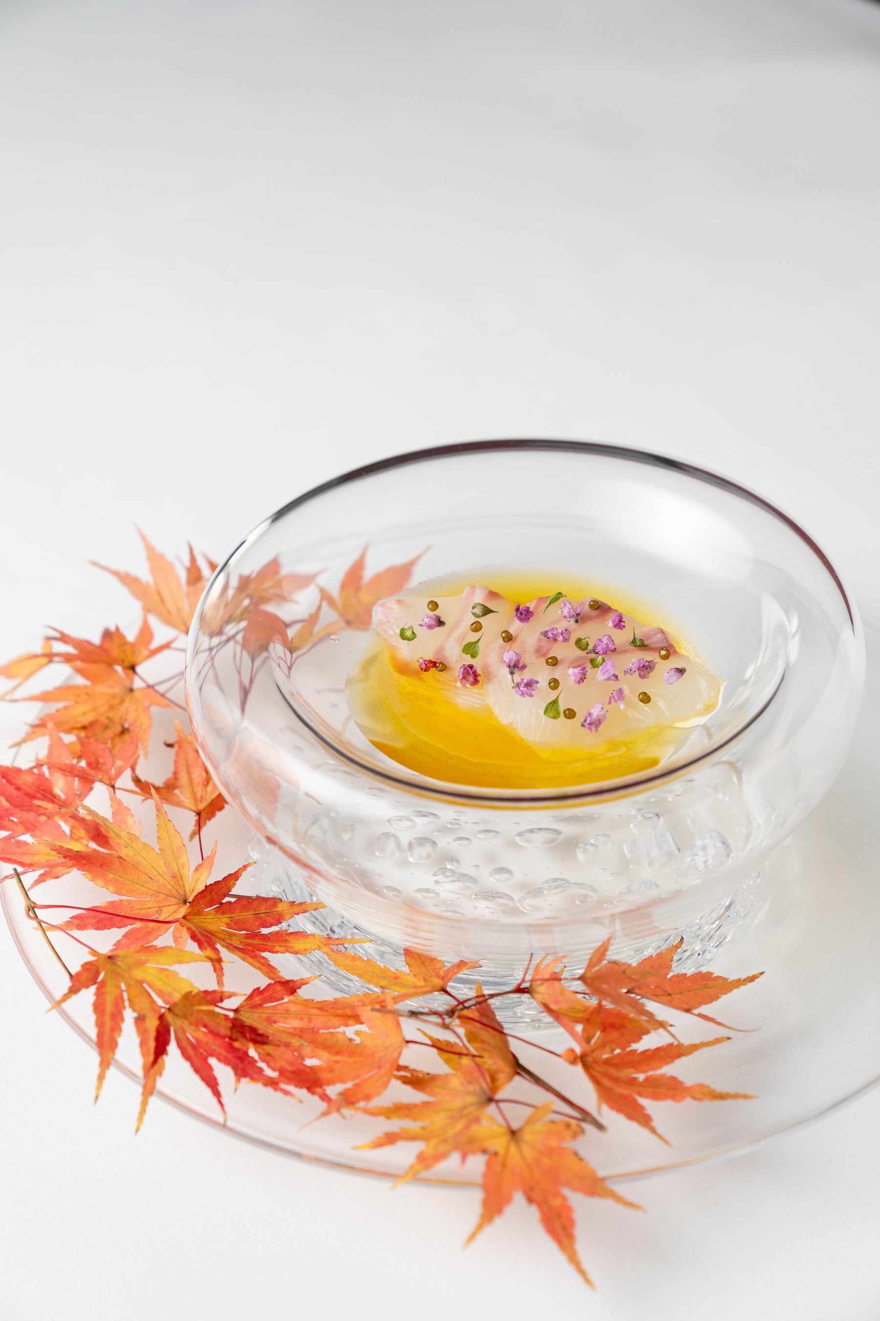 鯛の昆布〆花穂じそオイル和え ラズベリーヴィネグレット