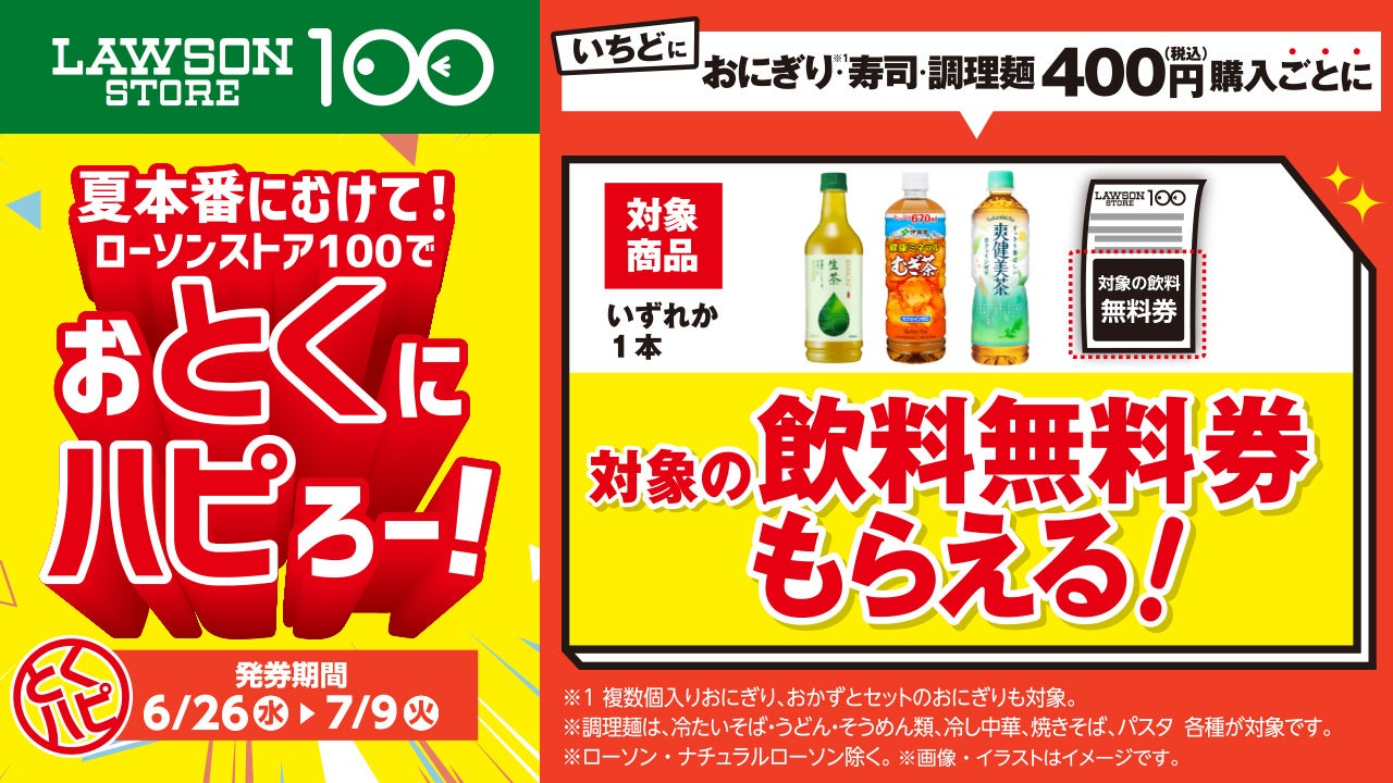 さらに、「デカ盛りチャレンジ」に続くお買得施策として、GW期間中も実施し好評いただいた「おとくにハピろー!」(『とくハピ』)キャンペーンを2024年6月26日(水)から7月9日(金)の14日間開催。対象期間中、おにぎり・寿司・調理麺を税込400円購入ごとに対象のお茶の無料引換券を進呈します。国産米や、有明産の海苔を使用し、ローソンストア100のこだわりがたっぷり詰まったおにぎり・寿司に加え、のど越しのいい麺、鰹だしの効いたつゆにリニューアルした冷し麺をはじめとした調理麺を対象の飲料と一緒にお楽しみ頂けます。