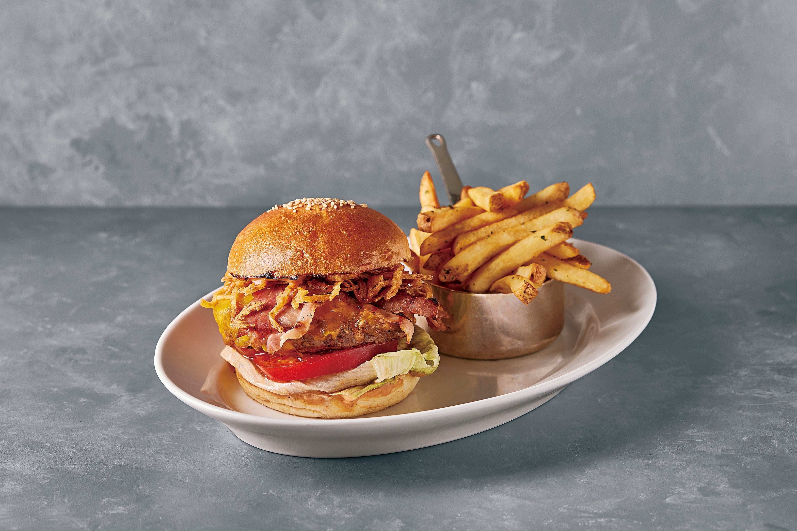オーク ドアの定番メニューとしてご好評いただいているダイナミックなグルメバーガー。バンズやチーズなどの具材とも相性がよく、肉の旨みと味わいがしっかりと感じられる赤身と脂肪のバランスよい牛100%のパティをつかっています。チャコールグリルでパティの表面を焼いたあと、900度のブロイラーでお好みの焼き加減に調整し、最後にもう一度チャコールグリルで仕上げることで、表面はカリッと、中はジューシーで凝縮された肉の旨みたっぷりに焼き上げます。クリームを使いほのかに甘くふんわりとしたバンズはホテルの自家製。肉の旨みを引き立てるソースは、ガーリックマヨネーズとBBQソースを合わせたオーロラソースです。クリスピーオニオンのトッピングが食感のアクセントに。本場アメリカ出身のシェフがこだわりつくした、牛肉の味わいたっぷりのステーキハウスらしい本格ハンバーガーです。