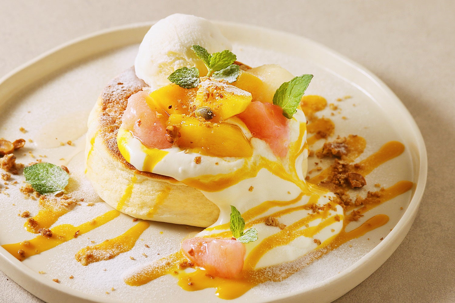 白桃とマンゴーの果肉がごろごろ、サマーパンケーキが新登場。