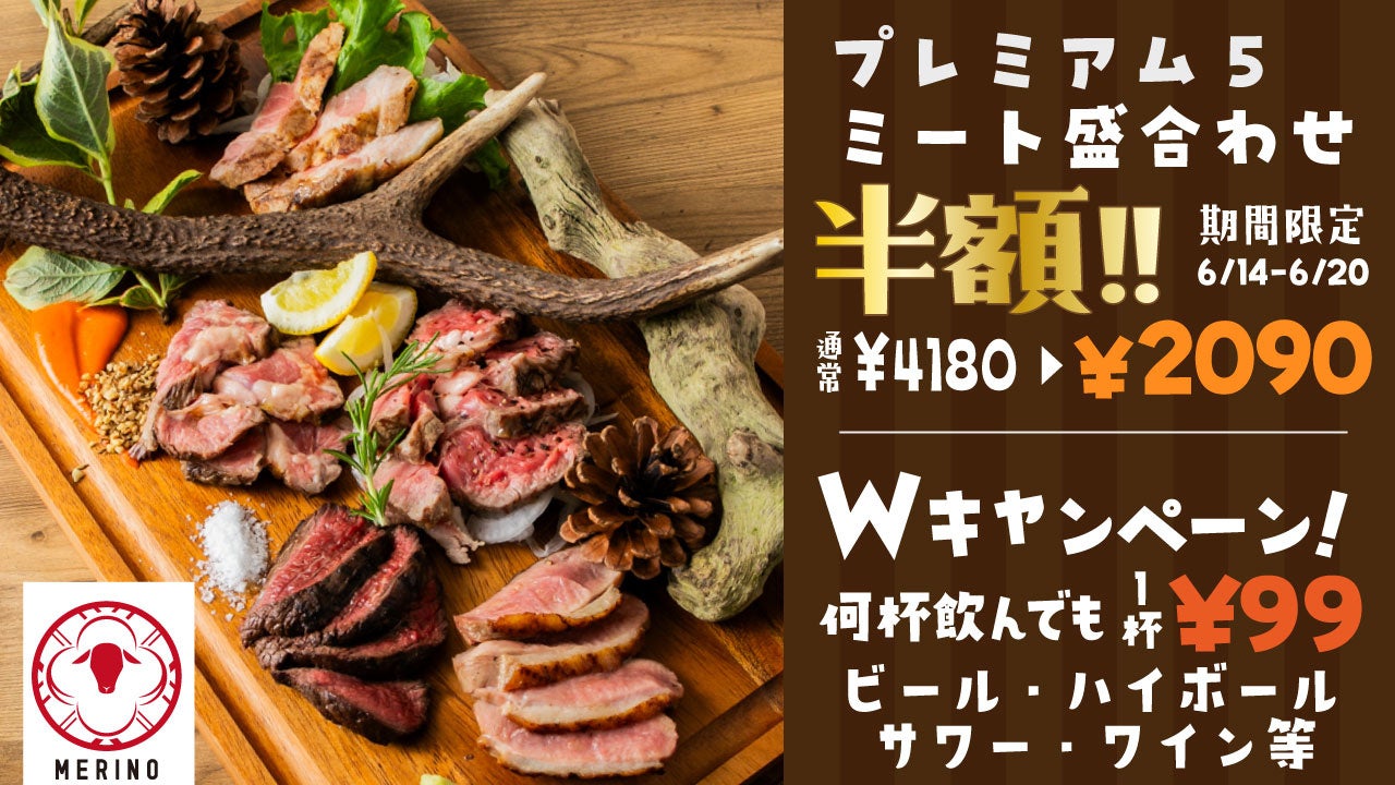 Wキャンペーン「プレミアム5ミート盛合わせ」通常4,180円が半額の2,090円と「生ビール・ハイボール・サワー等」が何杯飲んでも1杯99円!キャンペーンを6月14日(金)~6月20日(木)限定で開催