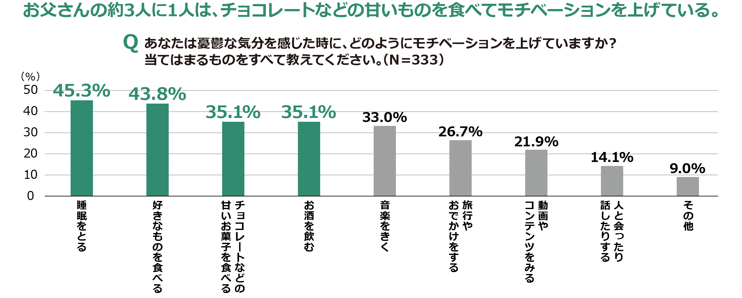 憂鬱な気分を感じた時にどのようにモチベーションを上げているか聞いたところ、「睡眠をとる」(45.3%)、「好きなものを食べる」(43.8%)、「チョコレートなどの甘いお菓子を食べる」(35.1%)、「お酒を飲む」(35.1%)と、主に「睡眠」と「食」がお父さんのモチベーションになっていることがわかりました。