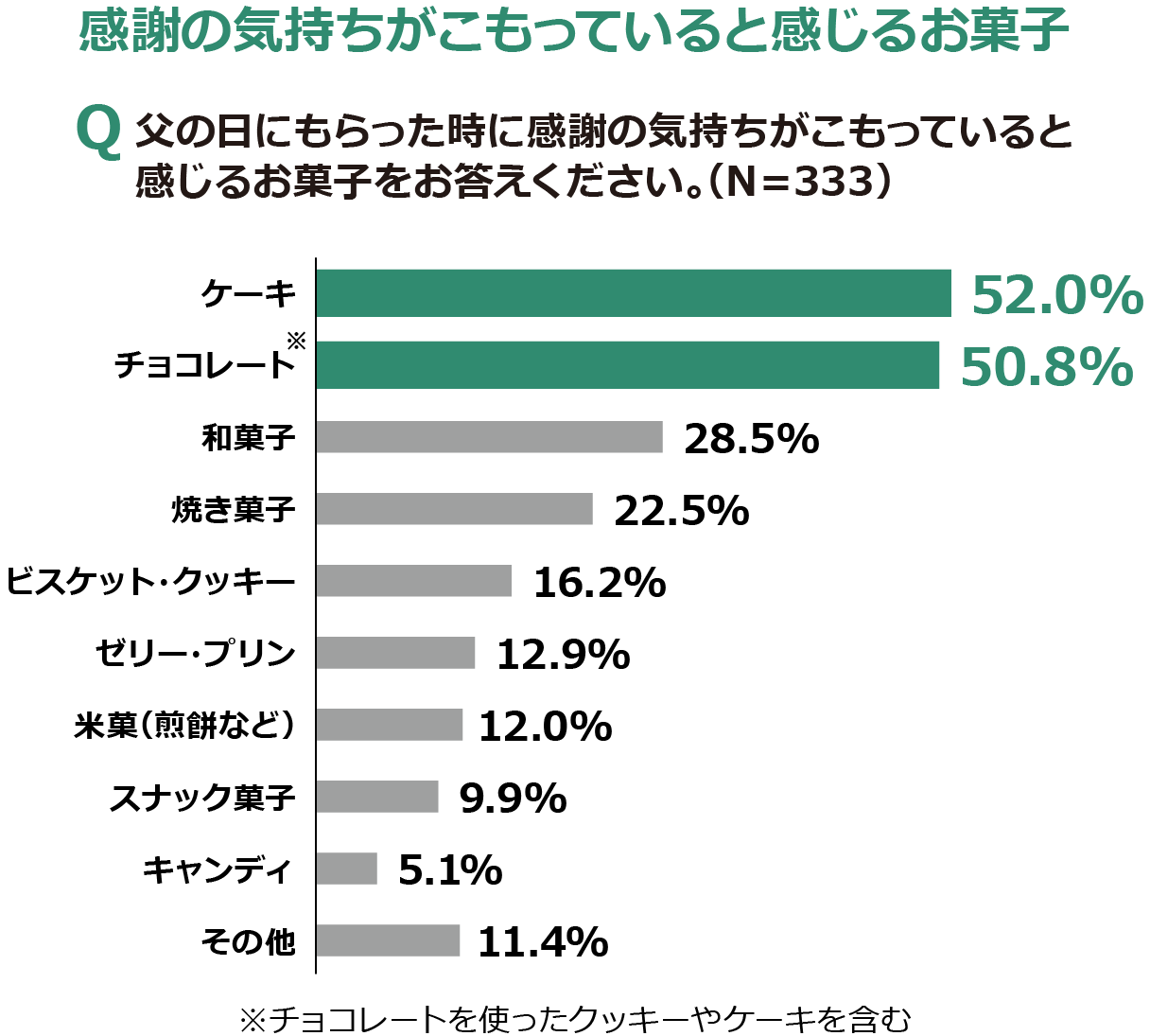 今回の調査で「父の日にもらった時に感謝の気持ちがこもっていると感じるお菓子」を聞いたところ、ケーキとチョコレートがTOP2に挙がりました。父の日に感謝を伝える際には、言葉とともにチョコレートを渡すことで、感謝の気持ちが伝わりやすくなると考えられます。ぜひ実践してみてください。