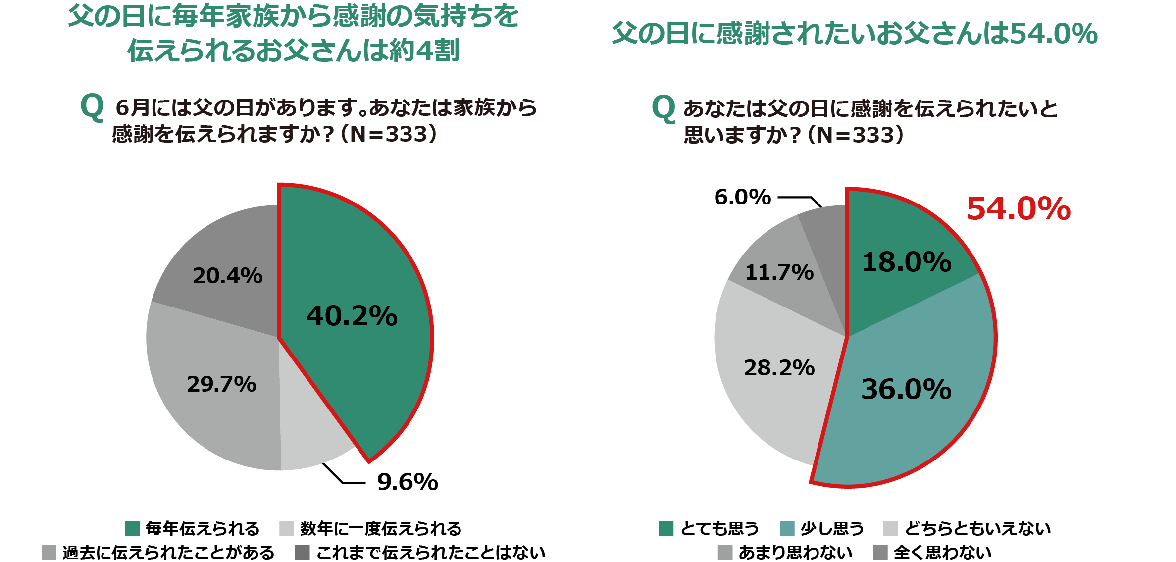 6月にはお父さんが主役のイベント「父の日」があります。父の日に家族から感謝を伝えられるかどうかを聞いたところ、「毎年伝えられる」と回答したお父さんは40.2%にとどまり、2割(20.4%)は「これまで伝えられたことはない」と回答しました。一方で、父の日に感謝を伝えられたいと「とても思う」「少し思う」と回答した人は、実際に伝えられている割合を超える54.0%に上り、半数以上のお父さんが感謝されたいと感じていることが明らかになりました。