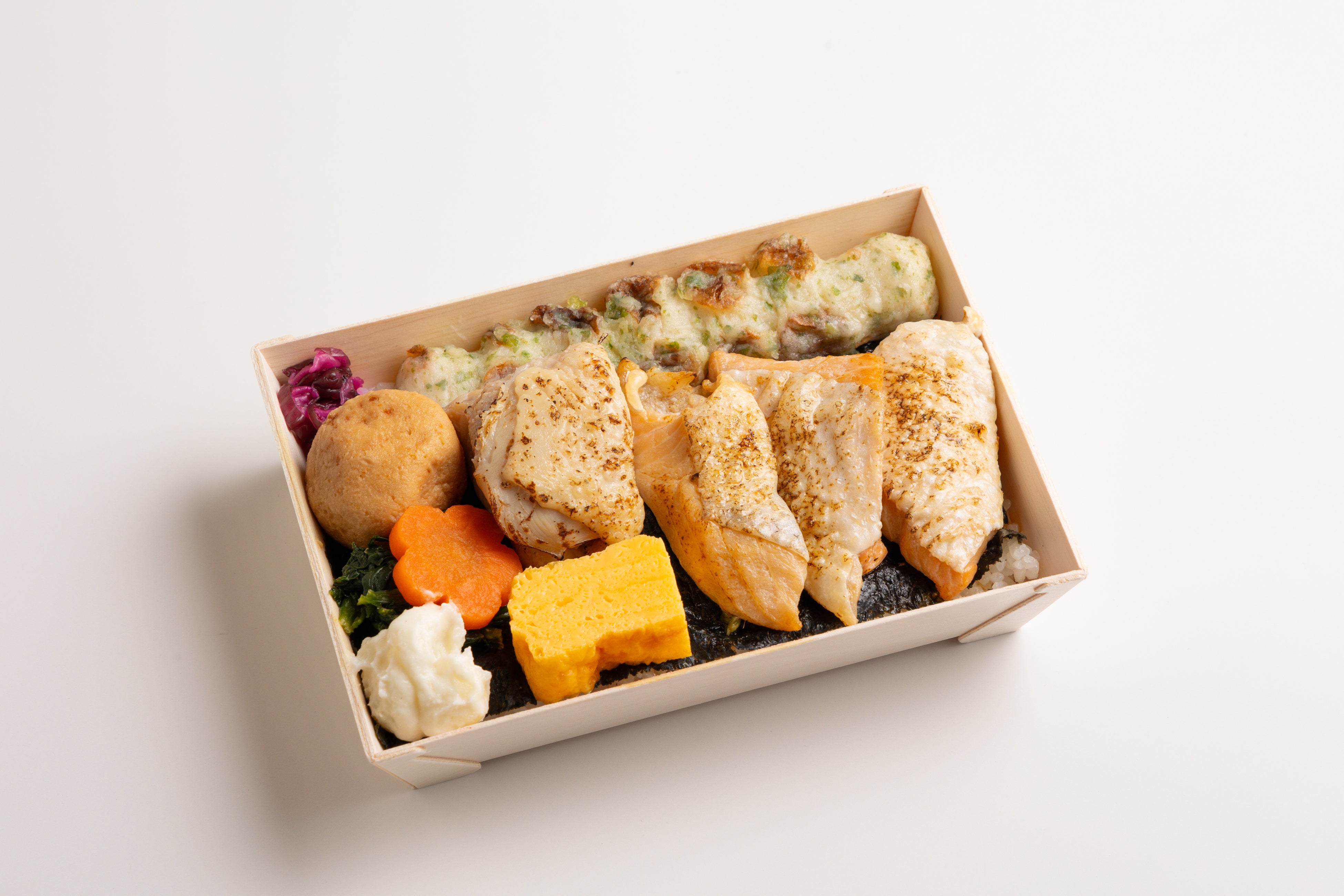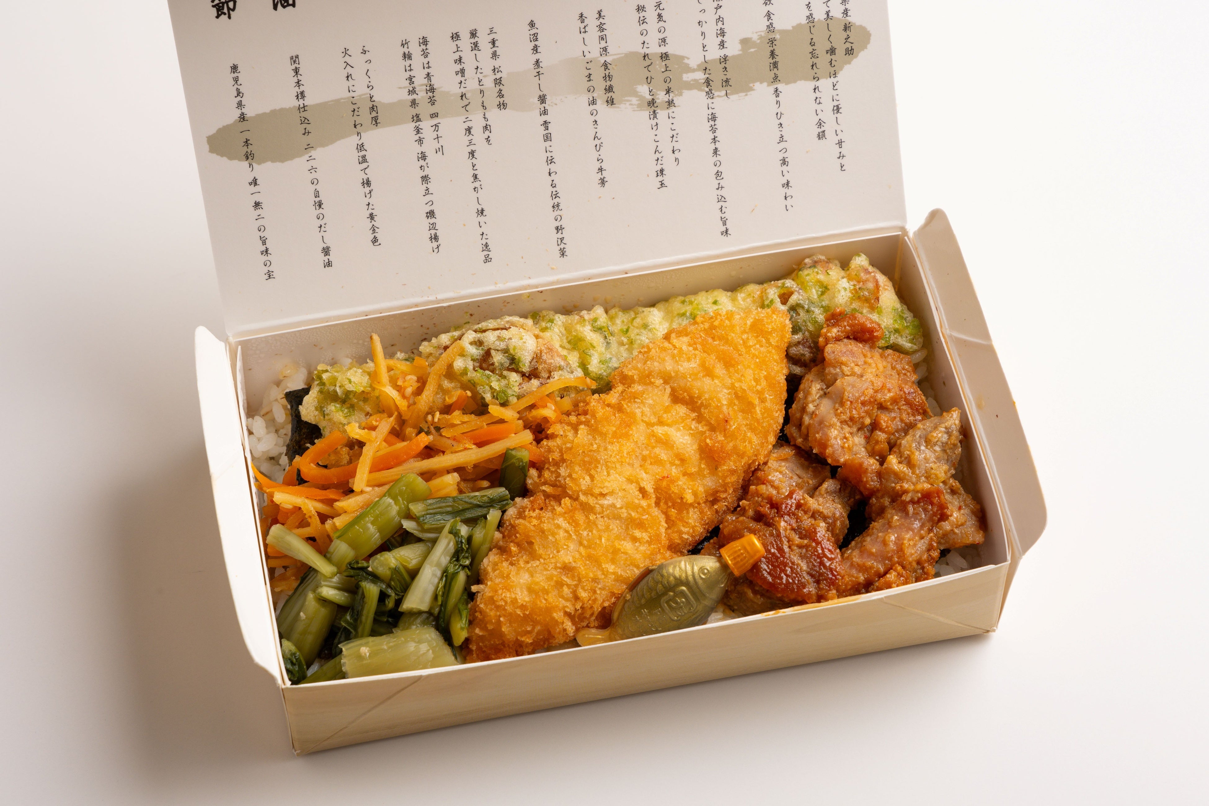 日本全国から厳選したこだわりの食材を使って、全てのおかずが主役になるよう作り上げた海苔弁です。おかず単体でのおいしさはもちろん、ご飯と海苔との調和もお楽しみいただけます。