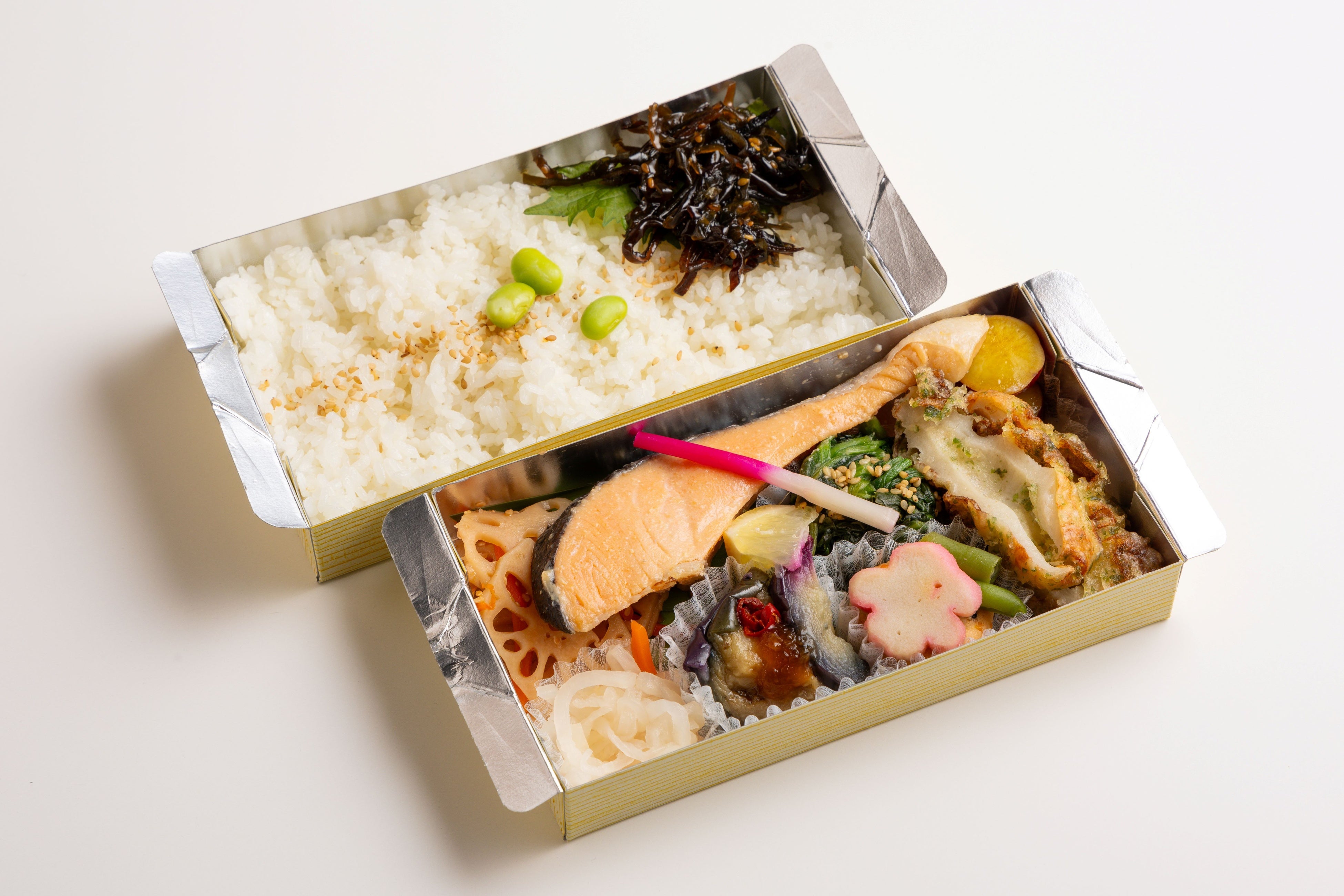 一段目には絶妙甘辛タレで焼き上げ旨みたっぷり銀鮭西京焼きと、彩り豊かで飽きの来ない惣菜の数々。二段目には可愛らしく飾られたこだわりのごはん。「蓋を開けた瞬間嬉しくなる」にとことんこだわったお弁当です。