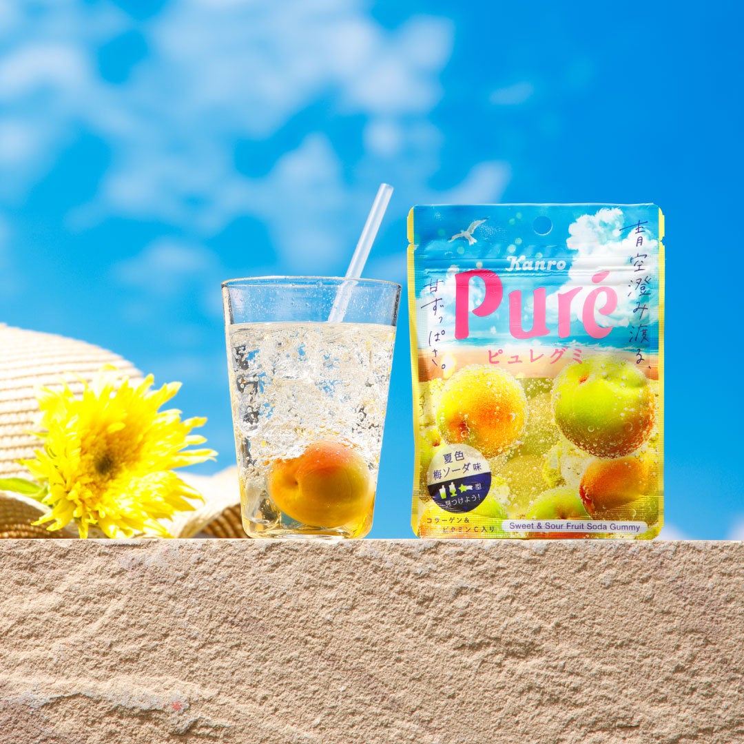 この度、夏にぴったりなすっきりとした味わいの「ピュレグミ夏色梅ソーダ」を発売します。“梅仕事”が始まるこの時季、風物詩ともいえる“梅シロップ”と、夏らしい爽やかなソーダを組み合わせ、甘ずっぱさが広がる「夏色梅ソーダ味」に仕上げました。グミ粒は梅ソーダをイメージした白と黄緑のツートンカラーで、出会えたらラッキーなシークレット型として、「ソーダグラス型」2種と「流れ星型」1種を潜ませています。爽やかな味わいの「夏色梅ソーダ味」で、いつかの夏を思い出したり、夏が待ち遠しくなったりと、心動かされるひと時をお過ごしください。