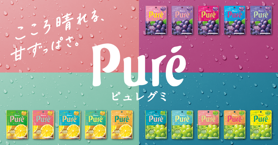 ピュレグミは、心地よい果肉食感が特徴で、一粒食べるたびにフルーツのフレッシュな甘ずっぱさが口に広がる、食べた瞬間こころが晴れるように、ちょっとハート(気持ち)があがるハート型のグミです。2002年の発売以来幅広い世代の方からご愛顧いただき、グミ市場売上No.1ブランド※として市場を牽引しています。
