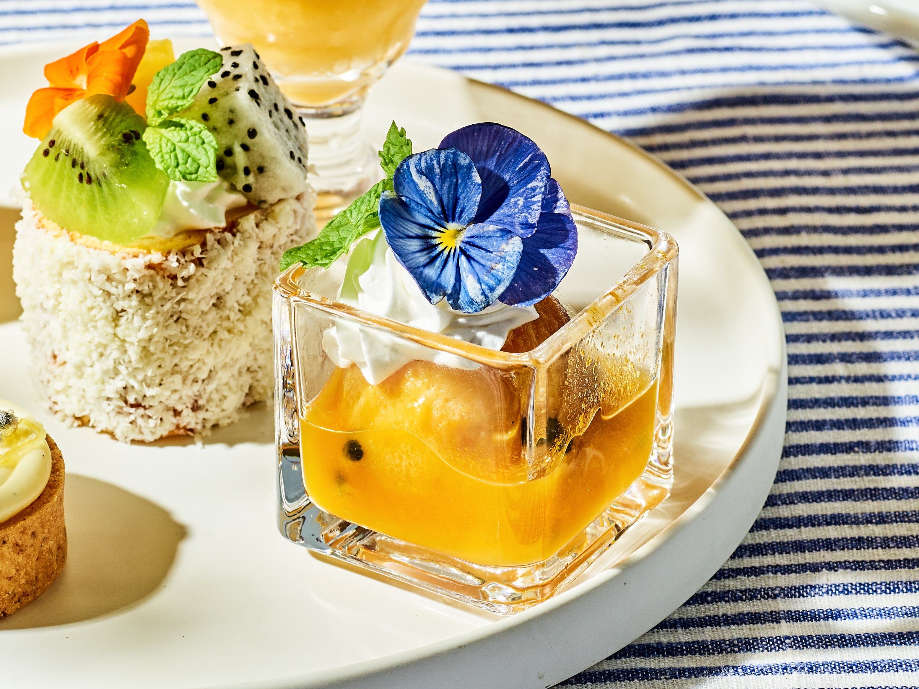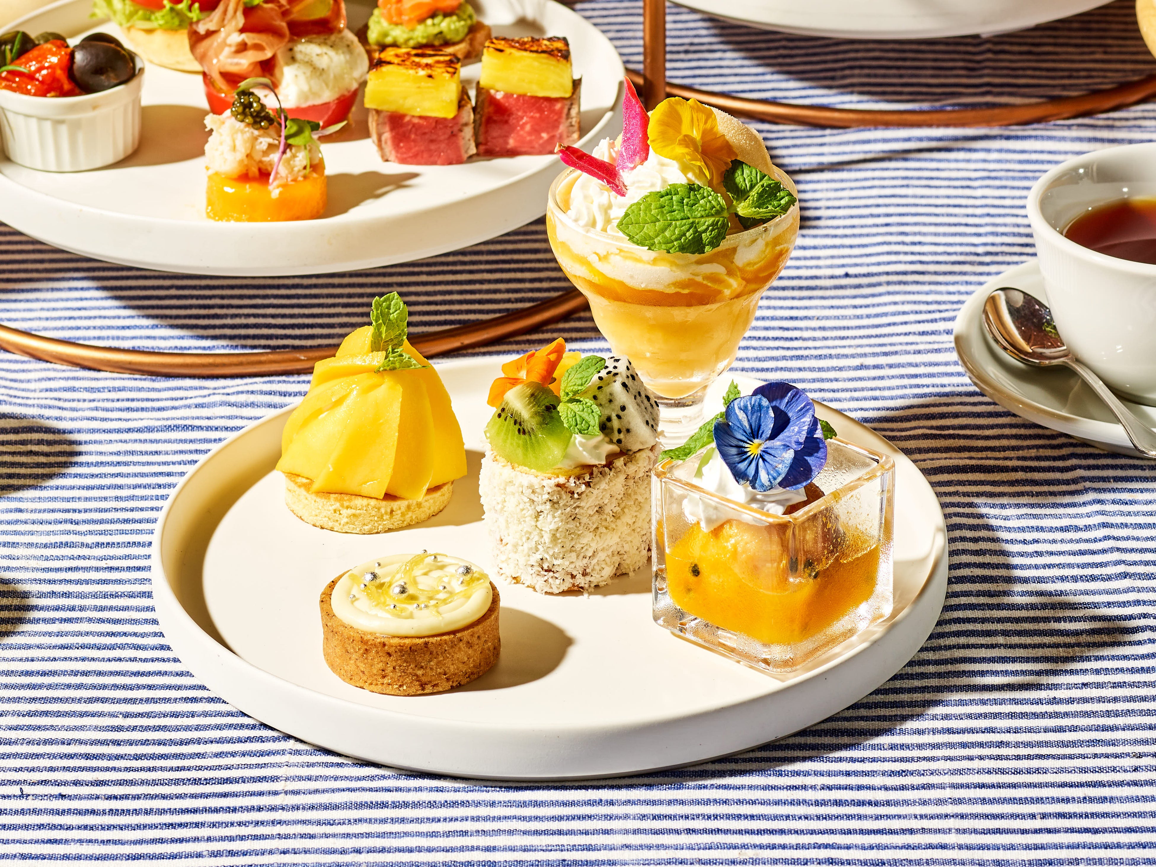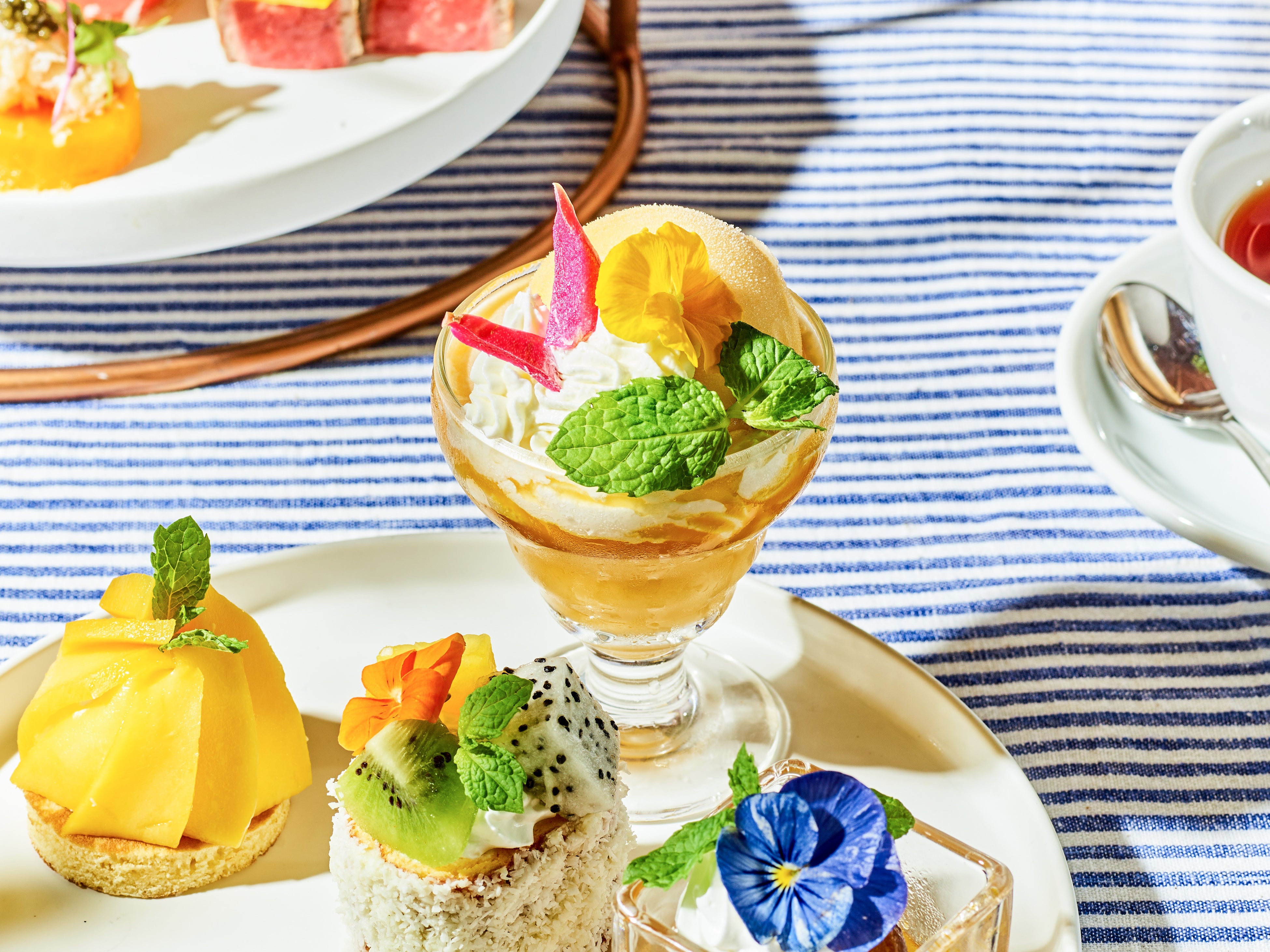 「Tropical Afternoon Tea」では、夏の陽気を感じながらお楽しみいただけるトロピカルな風味と贅沢な素材を取り入れています。スイーツの中でも特に、マンゴーパッションパフェは、一口食べるごとに南国の風を感じられ、ナポリ名物のババにはパッションフルーツを組み合わせ、甘酸っぱい風味とトロピカルな味わいが夏の暑さを忘れさせてくれます。