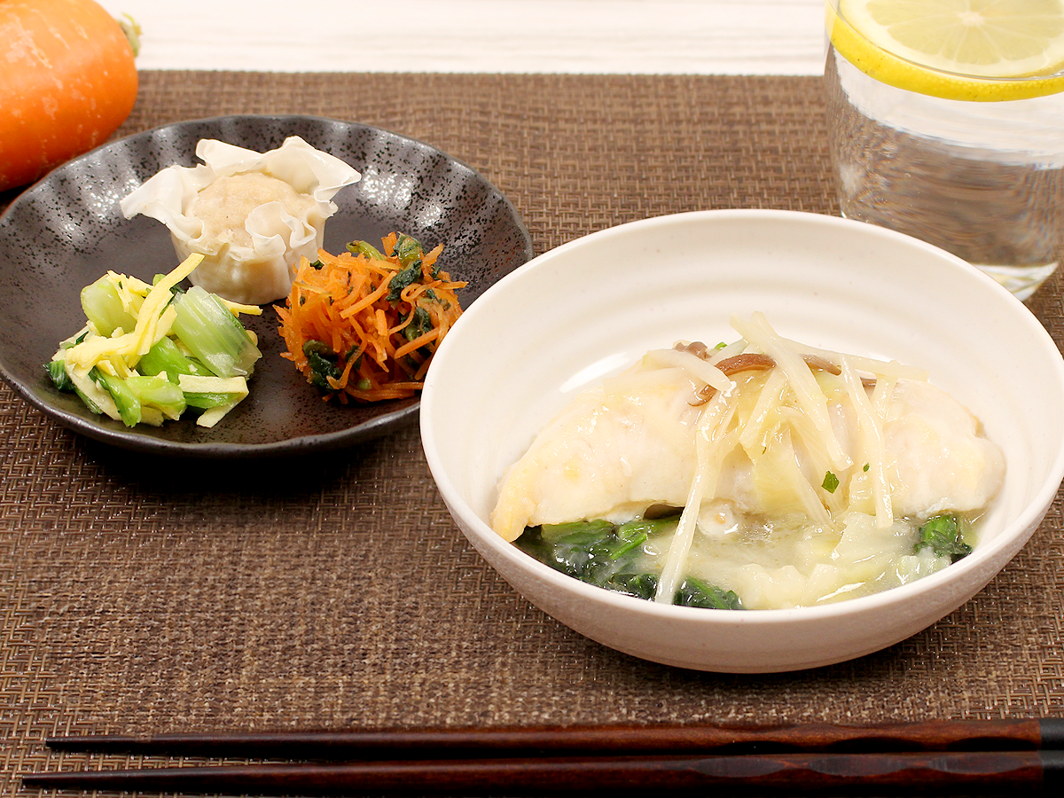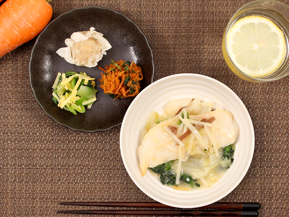 ふっくらとした白身魚にシャキシャキのキャベツ、タケノコ、きくらげ、そこにさっぱりしつつもコクのある白湯ソースが見事に調和しています。魚も野菜も食べたい方にぜひおすすめしたい逸品です。副菜は、小松菜とたまごの和え物、焼売、人参のオイスターソースです。