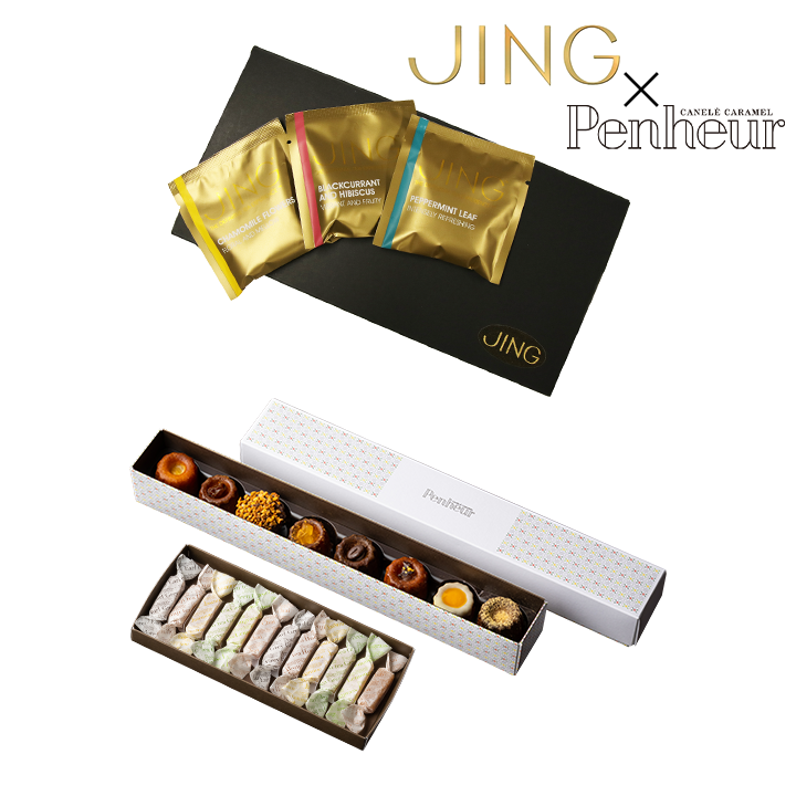 JINGTEAからはノンカフェインティー3種(各4袋)、Penheurからは定番のハナカヌレ(8種/各1粒)と12種(各1個)もの味が楽しめる生キャラメルとのセットです。