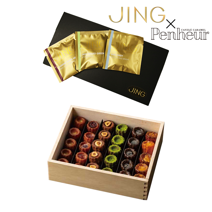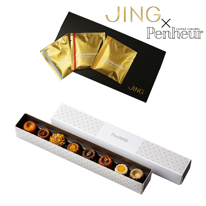 JINGTEAの定番人気の3種(各4袋)のセット、Penheurからは定番5種/季節のカヌレ3種(各1粒)が入ったセットです。