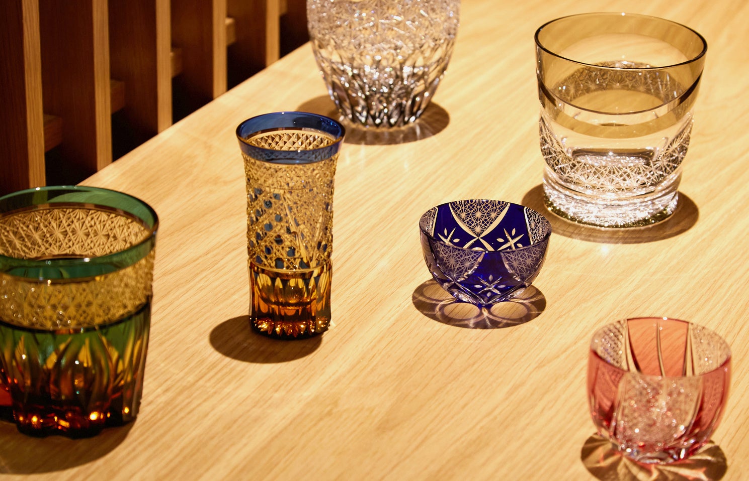 東京は「江戸」を代表する伝統工芸として「江戸切子」にフォーカス。日本を代表する巨匠が率いる老舗から、新しい造り手まで、それぞれに特徴を持つ名工が営む5つの工芸所を厳選。今未でしか手に入らないオリジナルの特注商品として、十二支の干支を冠したぐい呑み、グラス(12個セット・箱入り)もあつらえました。