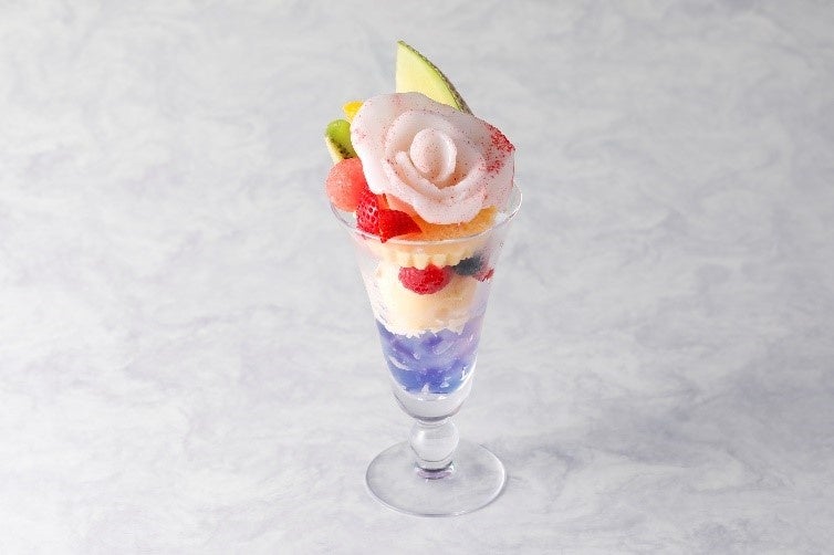 横浜高島屋開店65周年を記念した、限定のパフェです。高島屋のシンボルフラワーであるバラをライチソルベで再現し、季節のフルーツでデコレーションしました。港町横浜をイメージしたカラーのブルーから着想した、レモン風味のバタフライピーのゼリーが色鮮やかです。