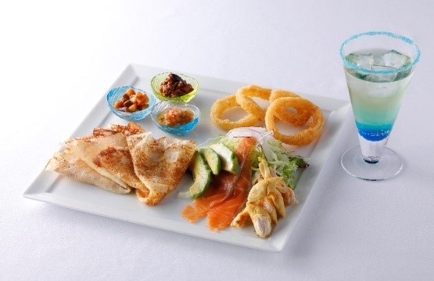 スパイスで香り付けした蒸し鶏やサーモンのマリネ、アボカドを3種類のオリジナルソースと一緒にもちもち食感に焼き上げた米粉のクレープに包んでお召し上がりください。横浜の海をイメージした青いサラトガクーラーと相性抜群です。お一人さまでのご利用や、お仕事帰りなどのシーンで気軽にお楽しみいただけます。