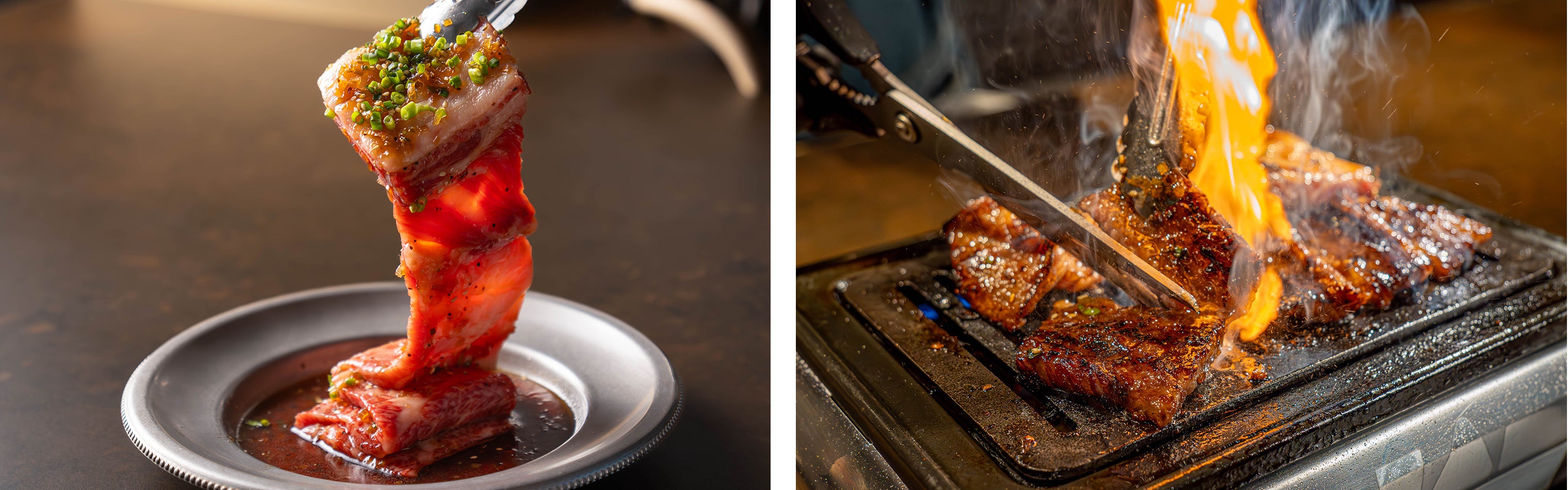 広げると約25cmとなる超ロングカットのお肉はインパクト絶大。豪快に焼き上げ、2~3名でシェアしてお楽しみいただけます。タレは、マルウシミート定番の醤油ベースの淡麗ダレ「マルウシ旨ダレ」、新宿内藤唐辛子を使った「旨辛ダレ」の2種からお選びいただけます。