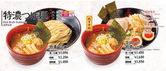 時間をかけてじっくりと炊き込むことにより、豚骨と魚介の旨味を極限までに引き出した「濃厚豚骨魚介スープ」。スープとの相性を最大限引き出すため小麦粉の配合にこだわり、香り・コシ共に妥協を許さない極太麺。[並・中・大]の3サイズが同一料金。お腹いっぱい召し上がっていただけます。