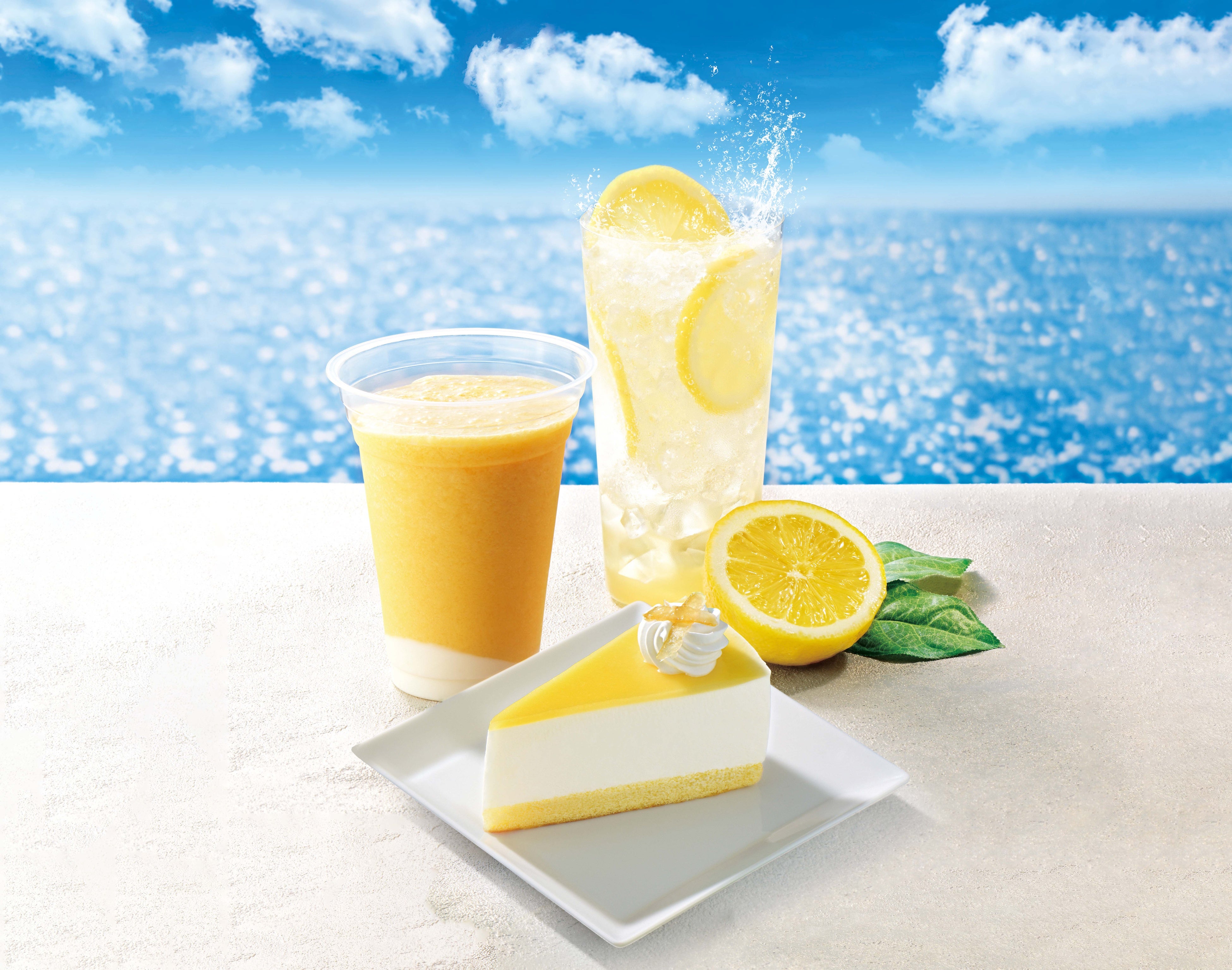 夏の定番「レモンスカッシュ~はちみつ入り~」は、ほろ苦いレモンピールとはちみつの優しい甘さがマッチした、すっきり爽やかな大人な味わいに仕上げました。なめらかで軽い食感の「レモンレアチーズケーキ」は、レモンの酸味とレアチーズの爽やかな味わいをお楽しみいただけます。また、ホイップクリームの上にレモンピールをトッピングし、清涼感を演出しています。