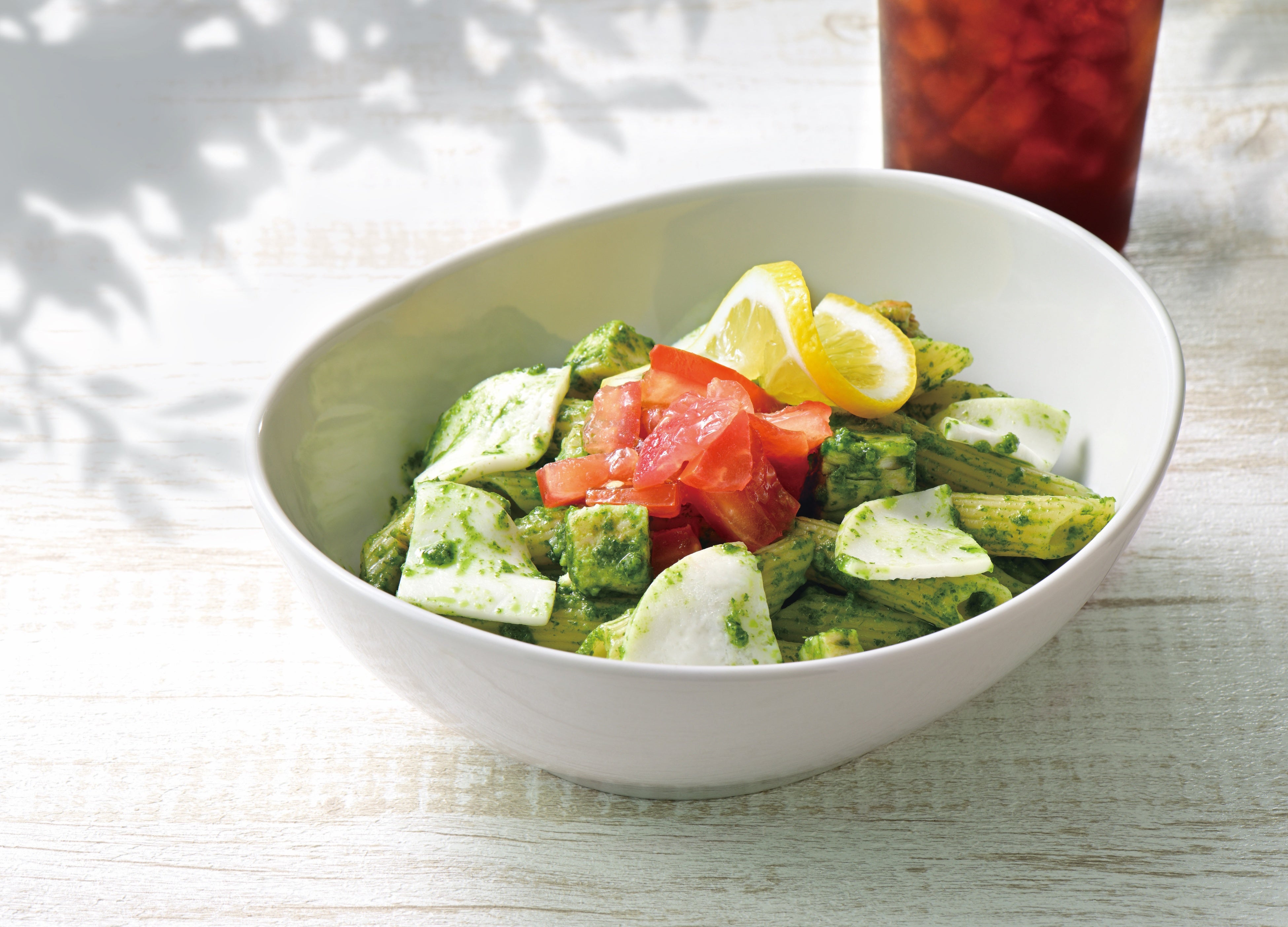 大葉ソースをグリルチキンと合わせ、モザレラチーズとフレッシュトマトにレモンの爽やかさがアクセントになった、さっぱりとした味わいのペンネです。 |