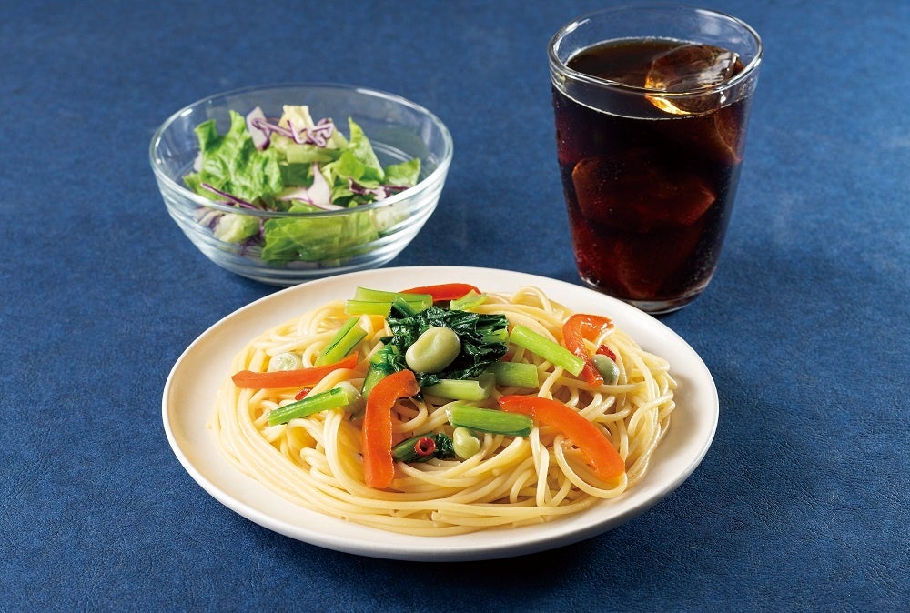 同日発売の「彩り野菜と利尻昆布だしの和風ペペロンチーノ」は、日本三大昆布のひとつとされている利尻昆布のだしの旨みと、唐辛子の程よい辛味の効いた味わいがお楽しみいただけます。赤パプリカや小松菜などの野菜で彩りも鮮やかに仕上げました。香ばしい焼きあごの風味と利尻昆布だしの上品でまろやかな旨みを、お好みのドリンクと合わせてご堪能ください。