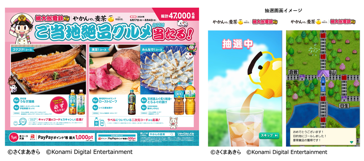 幅広い世代に愛されるすごろくゲーム「桃太郎電鉄」とコラボレーションし、「やかんの麦茶」などの対象製品を購入すると、ご当地の絶品グルメやデジタルポイントが抽選で当たるキャンペーンを展開します。 実際の「桃太郎電鉄」のゲームのように、サイコロをふって当選が分かるような仕掛けもありますので、ここでしか楽しめない「やかんの麦茶」と「桃太郎電鉄」のコラボレーションによるオリジナルコンテンツをお楽しみください。