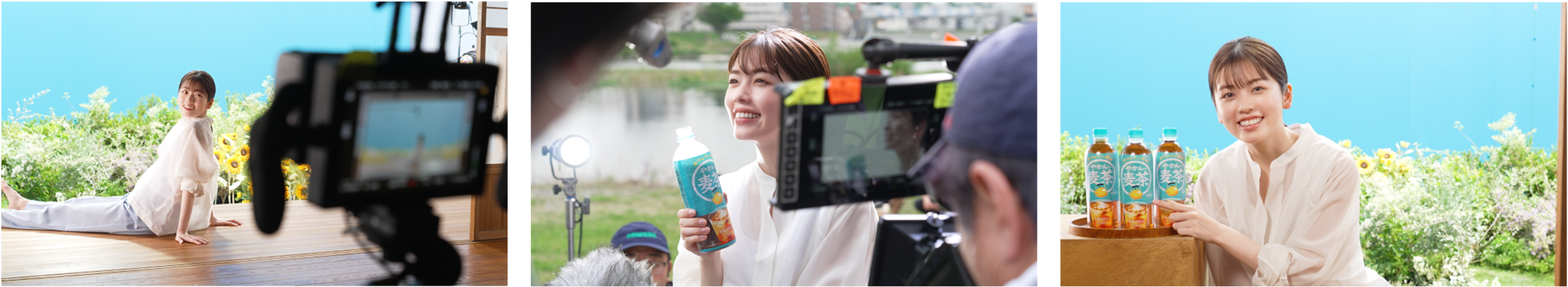 一人での撮影は「やかんの麦茶」の発売初年度以来3年ぶりとなる小芝さん。「おはようございます!」と、元気に挨拶を交わしながら撮影現場に登場しました。公園のベンチで休むシーンでは、太陽の光に眩しさを感じる中、「今の枝の揺れ方が完璧だった」と褒め合うスタッフの会話に割り込んで、「私は~?」と可愛らしい一面を見せるなど、和気あいあいとした雰囲気で撮影が進みました。