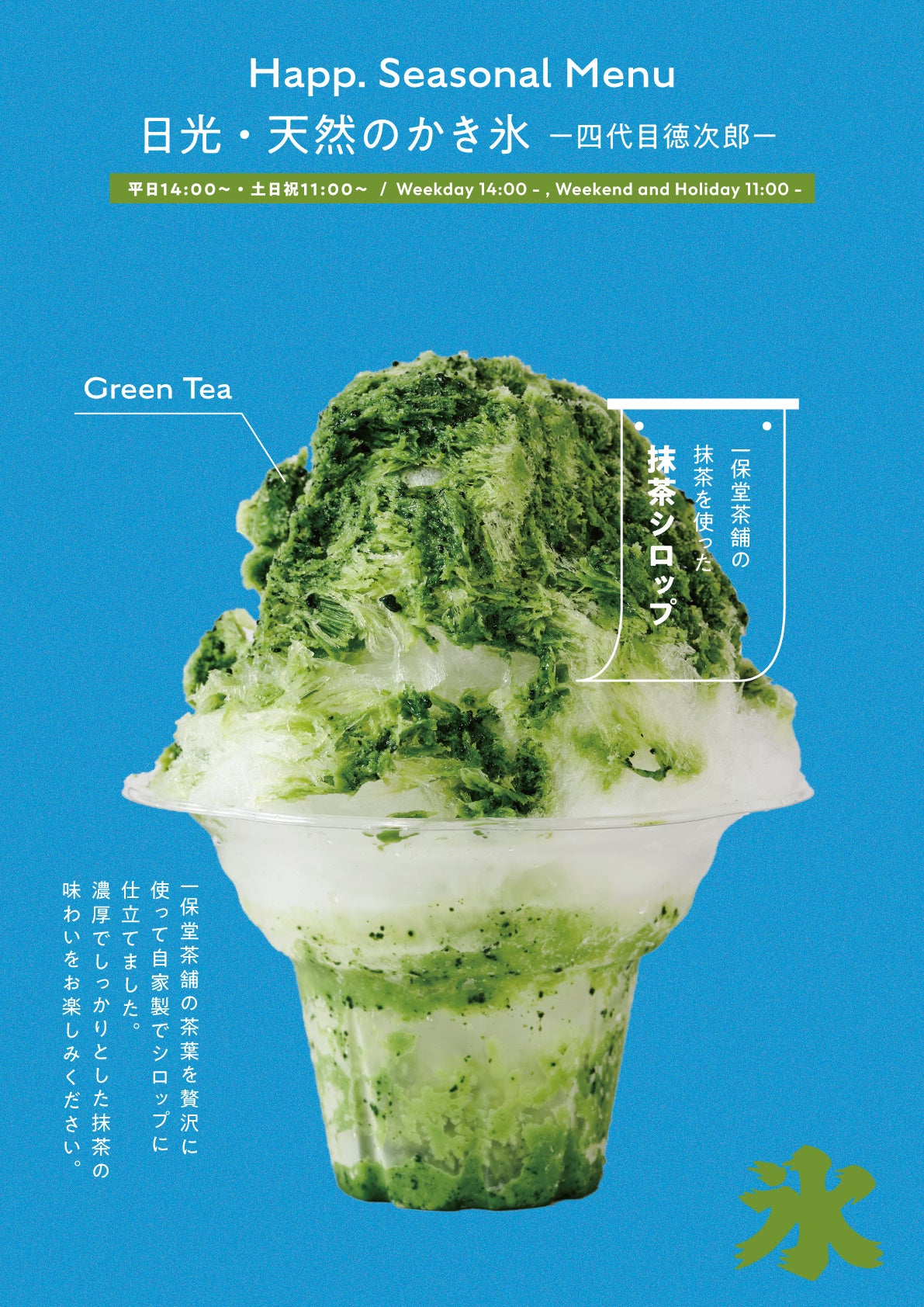 日光四代目徳次郎特製いちごとゆずのシロップの他に、本イベントでしか食べることのできない特別なお茶シロップ(一保堂茶舗の茶葉を使用)をご用意。京都「一保堂茶舗」のほうじ茶と抹茶を使用した自家製シロップは、風味豊かで格別の味わいです。香り高いお茶の味わいを是非お楽しみ下さい。