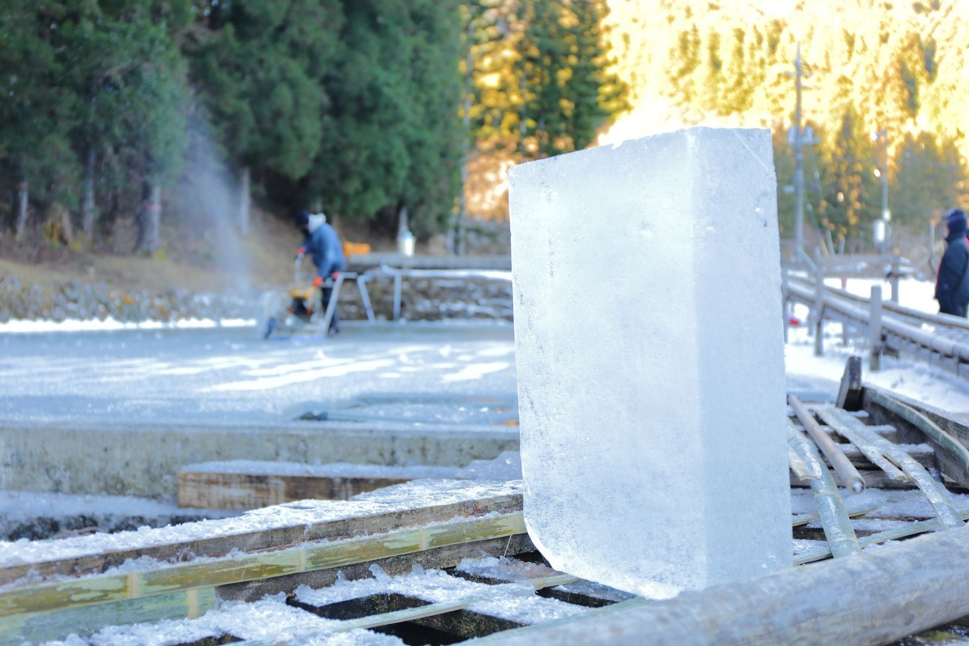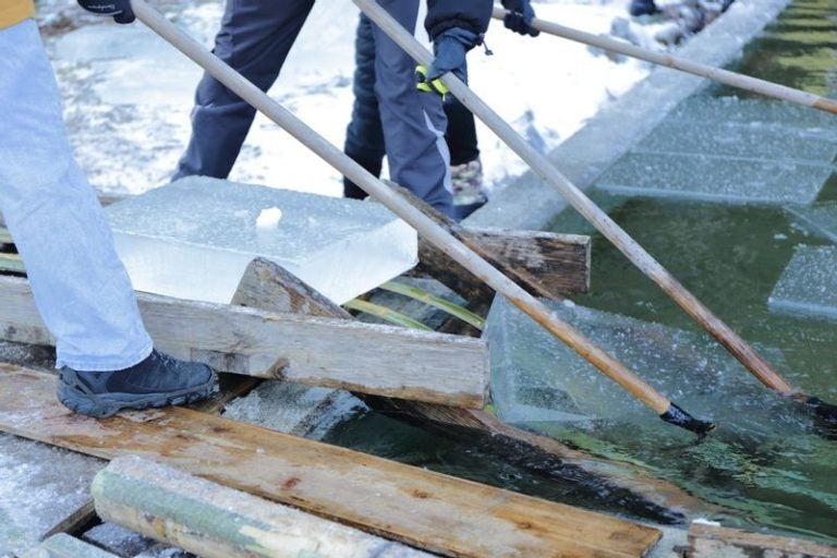 ※左)氷室「四代目徳次郎」の天然氷 ©︎SHUNGATE、右)氷室「四代目徳次郎」の天然氷 切り出し/引きあげ ©︎SHUNGATE