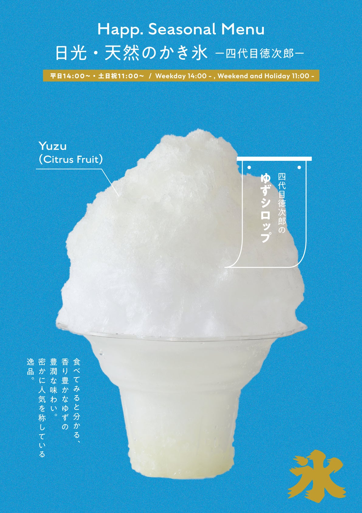 日本に5箇所しかない氷室の一を持つ、日光は四代目徳次郎。世界一硬い氷を目指し、丁寧にゆっくりと凍らせて作られます。雪の日は氷を守るため、深夜でも雪掻きを欠かさず、雨が降れば割り直します。自然の流れに逆らうことなくじっくりと作られた四代目徳次郎の天然氷は、硬くて透明度が高く、かき氷として薄く削った時も口の中で優しく溶けていきます。今回のPOP UPではその特別な天然氷を贅沢にたっぷりと削り、四代目徳次郎のオリジナルシロップ、「ゆず」、「とちおとめ」をかけてご提供します。