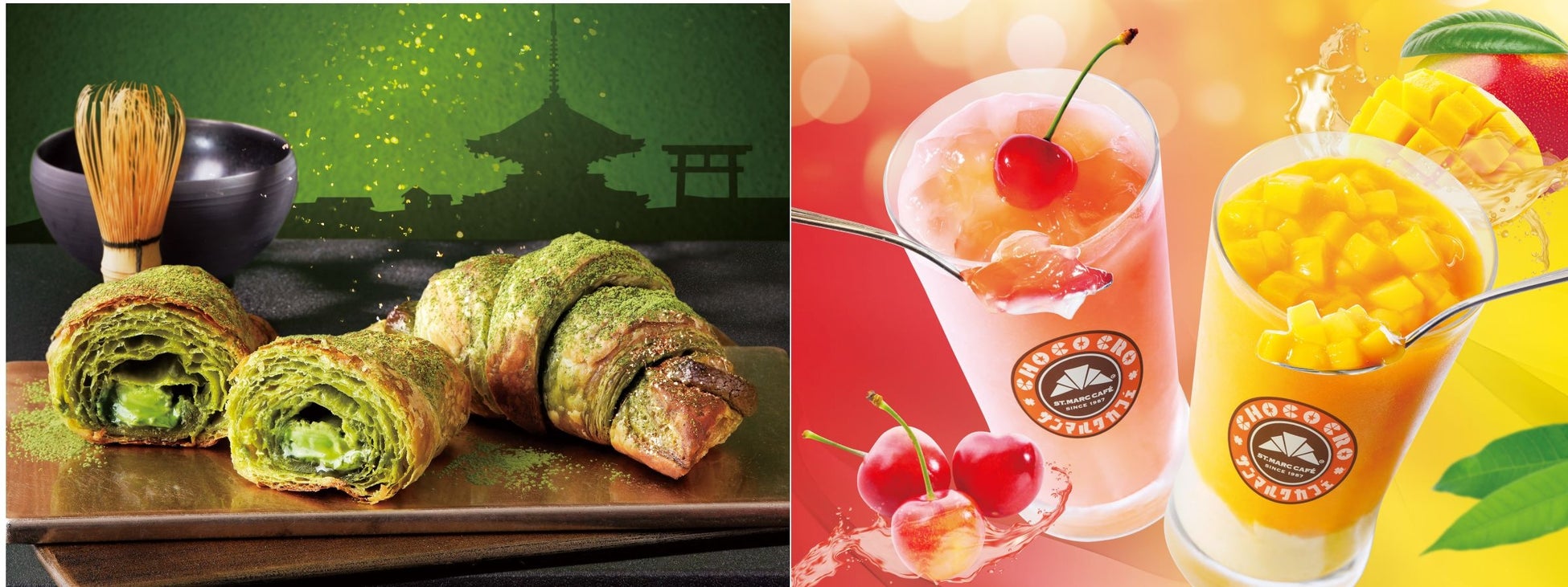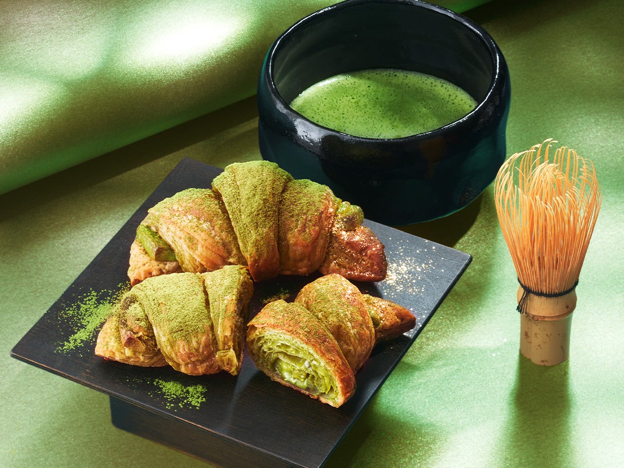 毎年多くの方に楽しんでいただいている祇園辻利とのコラボレーションメニューが、さらにゴージャスになり新登場いたします。チョコクロ全体でお抹茶を感じていただけるように、使用する食材全てに祇園辻利の宇治抹茶を使用しています。さらに、濃厚なお抹茶をより楽しんでいただけるように、中の抹茶チョコレート、抹茶クリームに使用する宇治抹茶の量、仕上げに振りかける宇治抹茶の量を昨年よりも増加させ、より濃厚で本格的な味わいとなりました。宇治抹茶が練り込まれたクロワッサン生地は、鼻から抜ける上品な宇治抹茶の香りを感じさせます。さらに今年は宇治抹茶に加え、金粉を振りかけており、華やかで高級感のある上品な見た目となっております。