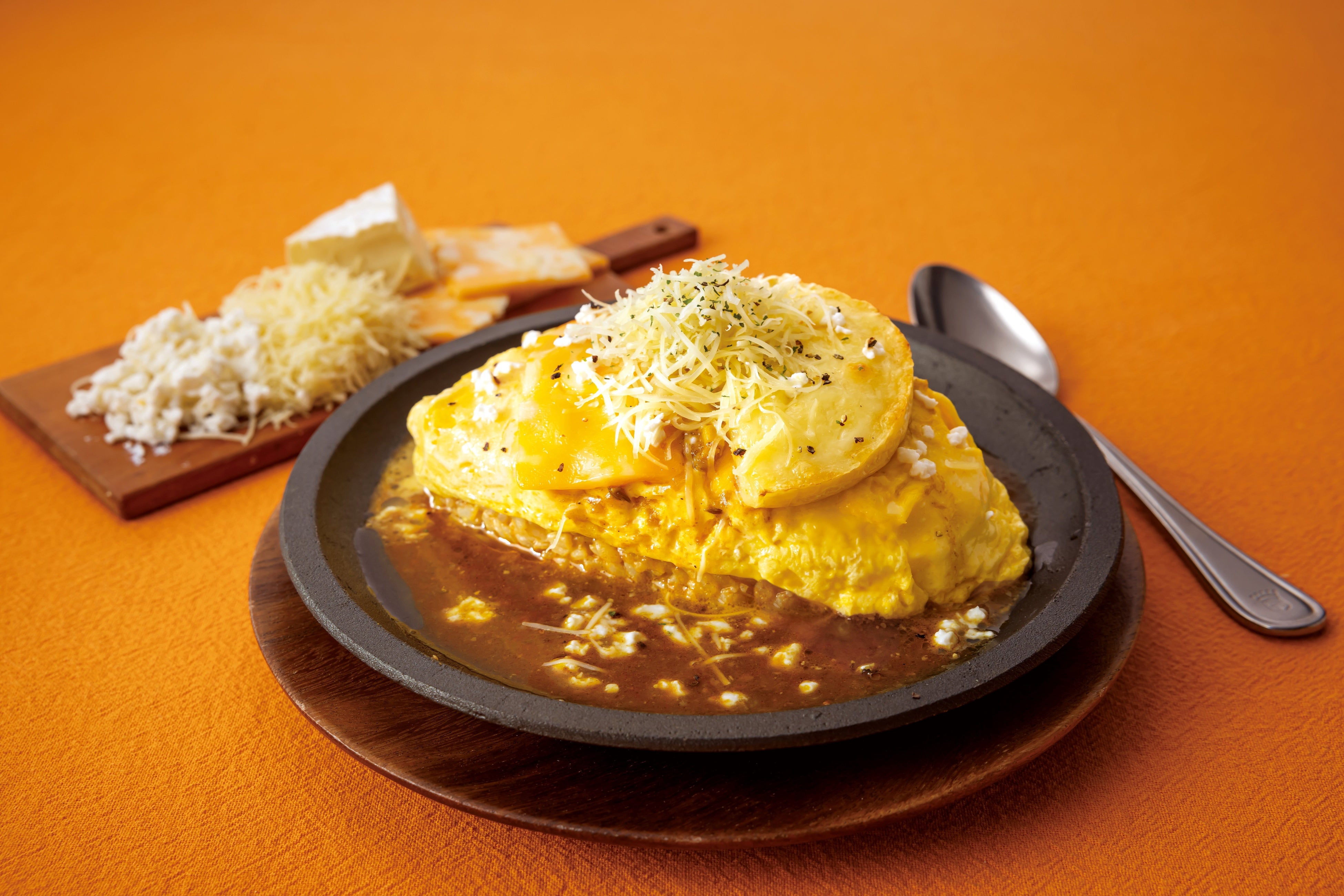 当店自慢のふわとろオムドリアに「カマンベールチーズ、パルメザンチーズ、コルビージャックチーズ、リコッタチーズ」の 4 種のチーズをトッピングしました。カレーソースのスパイシーな辛さを卵とチーズの優しい甘みが包みこみます。