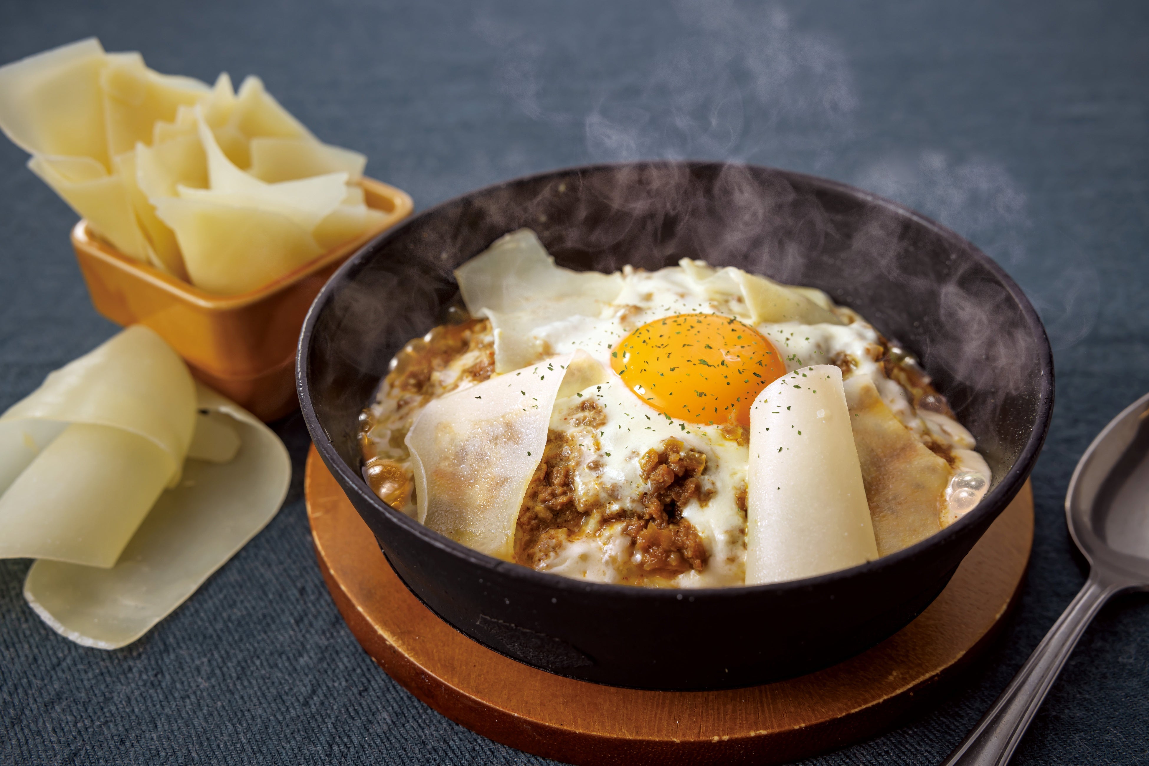 スパイシーなキーマカレーに薄く削ったリトアニア産の「デュガスチーズ」をトッピングしました。デュガスチーズのまろやかな旨味がキーマカレーと溶け合います。黄卵をくずしながらお召し上がりください。