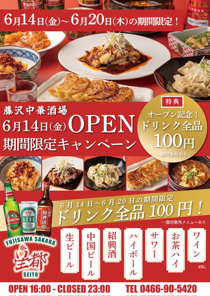 藤沢で人気の老舗本格中華「星都」がネオ中華酒場「星都」としてリニューアルオープン!店内お料理お酒もリニューアル!6月14日(金)〜6月20日(木)『何杯飲んでもドリンク1杯100円キャンペーン開催!』