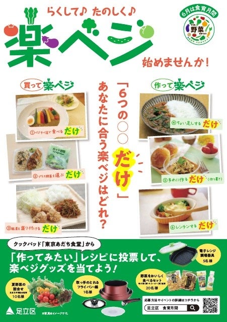 さらに、作ってみたい楽ベジレシピを選んで投票すると、抽選で夏野菜の詰め合わせなどの「楽ベジグッズ」が当たる企画も実施しています。 ※ 6月30日まで。足立区内在住・在勤・在学の方のみ対象