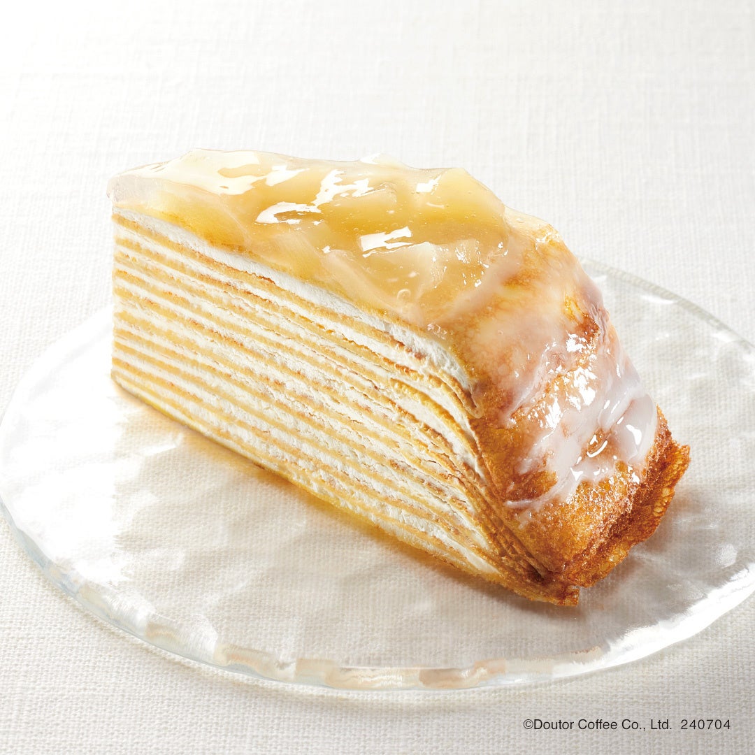 白桃の果肉をトッピングした、期間限定のミルクレープです。トッピングした果肉は食べた瞬間、じゅわっとした果実感を口いっぱいに楽しめます。また、ホイップクリームにも白桃の果汁とペーストを混ぜ込みました。白桃のやさしい味わいを感じながら、みずみずしくさっぱりとお召し上がりいただけます。