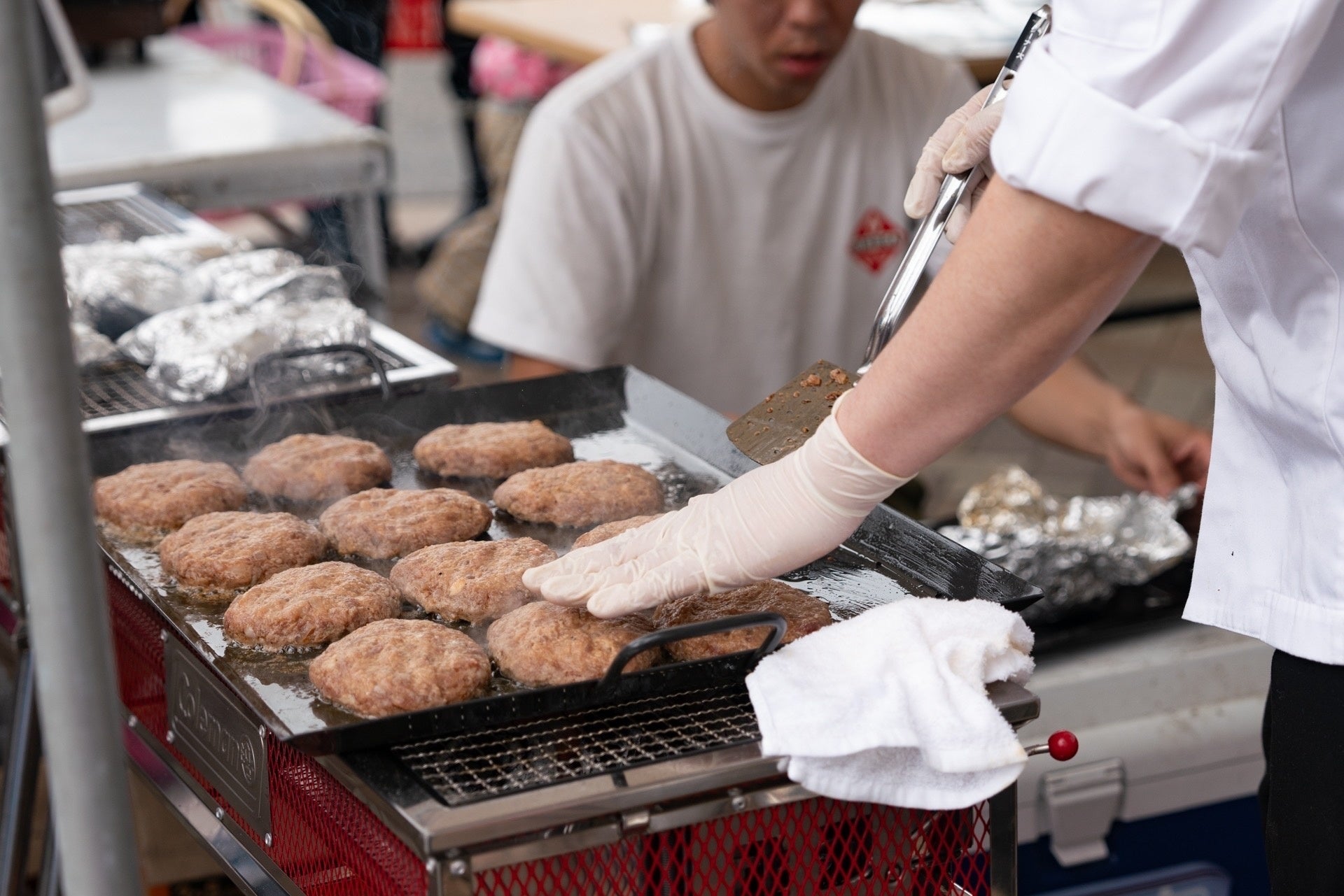 当日は、愛ふぁーむプロジェクトの趣旨に賛同する飲食店8店舗と企業1社が炊き出しに参加しました。提供メニューは、事前に被災地の方々のご要望を伺い、「避難所ではメニューが限られるので、他のものを食べたい」「ハンバーガーが食べたい」「生魚を久しぶりに食べたい」といった声を反映し、シェフたちが各々考案しました。その結果、被災地の方々のご要望に沿い、ハンバーガー、パエリア、天ぷら、海鮮丼など、合計14種類・約750食分の食事を提供することができました。