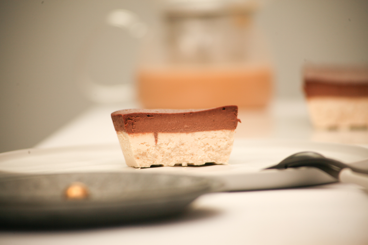 クリームチーズとサワークリームが織りなす、さっぱり濃厚なチーズケーキと上品で濃厚なビーントゥーバーチョコレートを使用したのチョコレートチーズケーキの2層となっており、