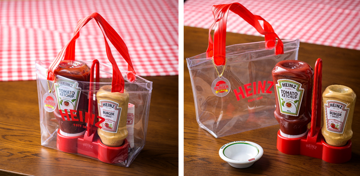 今回のイベントで当社が販売するのは、トマトケチャップ逆さボトルとバーガーソース、そしてこれらをテーブルに設置できる限定品のスタンド、トマトケチャップなどを入れるディッピングポットの4点を、「JAPAN BURGER CHAMPIONSHIP」キーチェーン付きのハインツロゴ入り透明バッグに入れた特別なセットです。グルメバーガー店やアメリカンダイナーなどでおなじみのケチャップスタンドは、置くだけで自宅でもバーガー店気分を楽しめます。また、アメリカンスタイルのバーガーソースはトマトベースの濃厚でクリーミーなソースに、ハーブの爽やかな味が効いた通常は業務用及び一部の別販路でのみ販売中の人気ソースです。