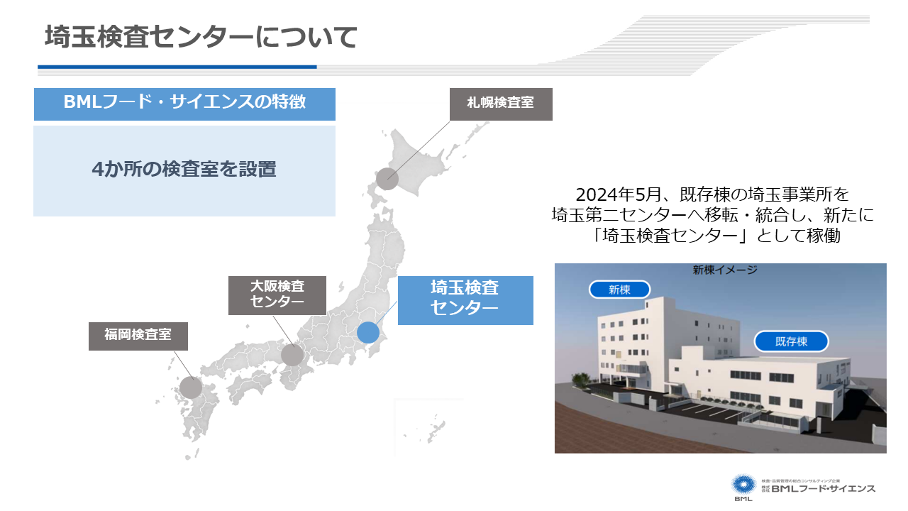 全国4県5か所に検査室を設置しておりましたが、食の安全・安心に関する社会的な要求や増加する検査ニーズに応えるべく、埼玉事業所と埼玉第二センターを統合・移転し、2024 年5月より新たに「埼玉検査センター」として稼働を開始しました。