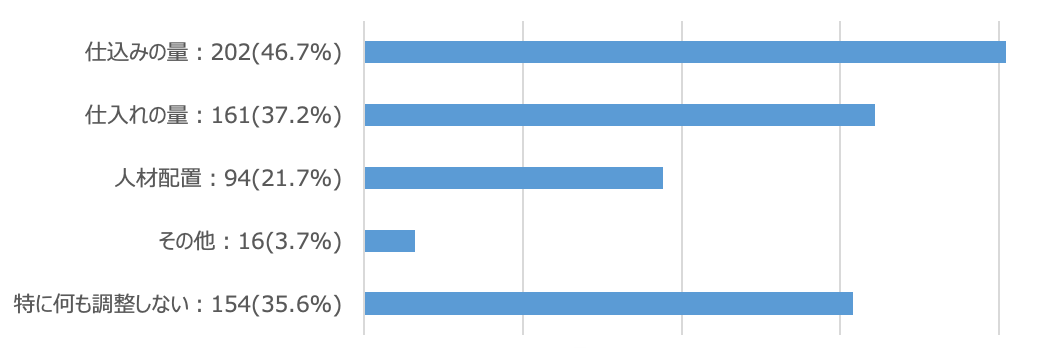 最も多かった回答は「仕込みの量」(46.7%)、次に「仕入れの量」(37.2%)、「人材配置」(21.7%)と続く結果になりました。