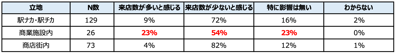 そこで、立地・業態別に、雨の日の来店数に差があるか調査したところ、立地では「商業施設内」が雨の影響少なく、来店数が多いと感じる割合が他の立地に比べて高いことがわかりました。