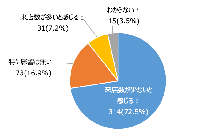 次に、雨の日は来店数に影響があるか聞いたところ、72.5%が「来店数が少ないと感じる」と回答。雨の日は飲食店に影響があることがわかりました。