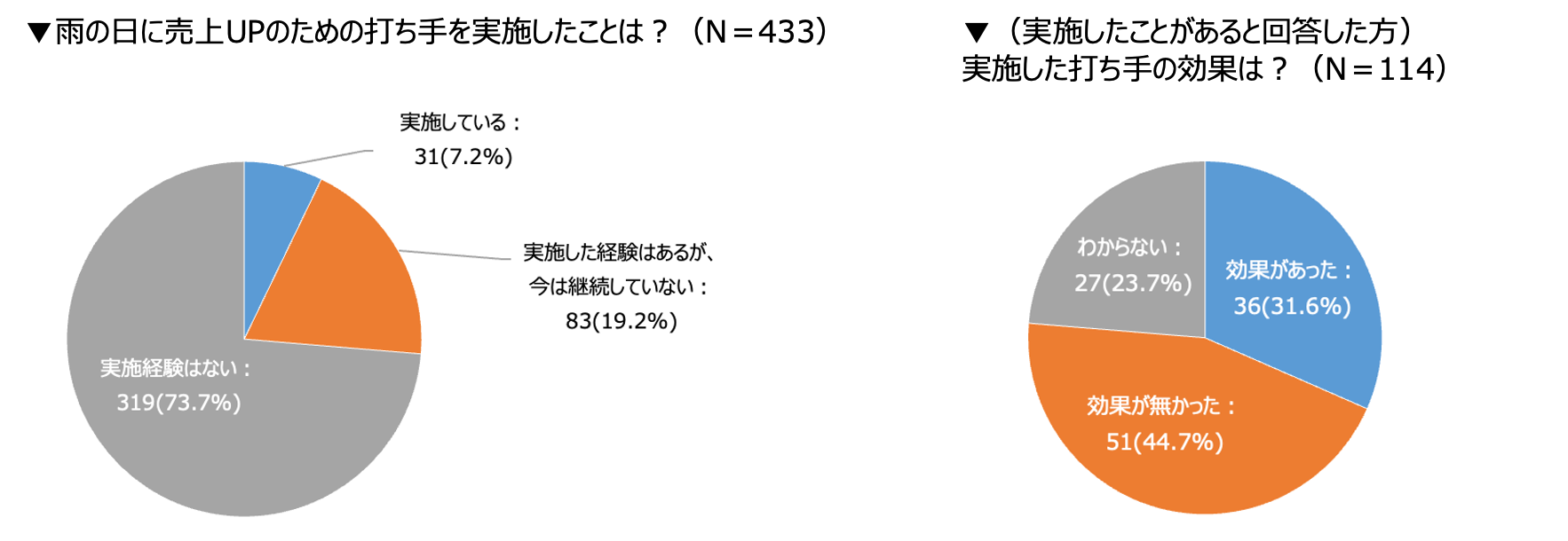 雨の日の来店客の減少に対して、売上UPのための対策をしているか聞いたところ、「実施している」と回答したのはわずか7.2%にとどまり、「実施した経験はあるが、今は継続していない」(19.2%)を合わせると、実施している(したことがある)飲食店は26.4%という結果になりました。