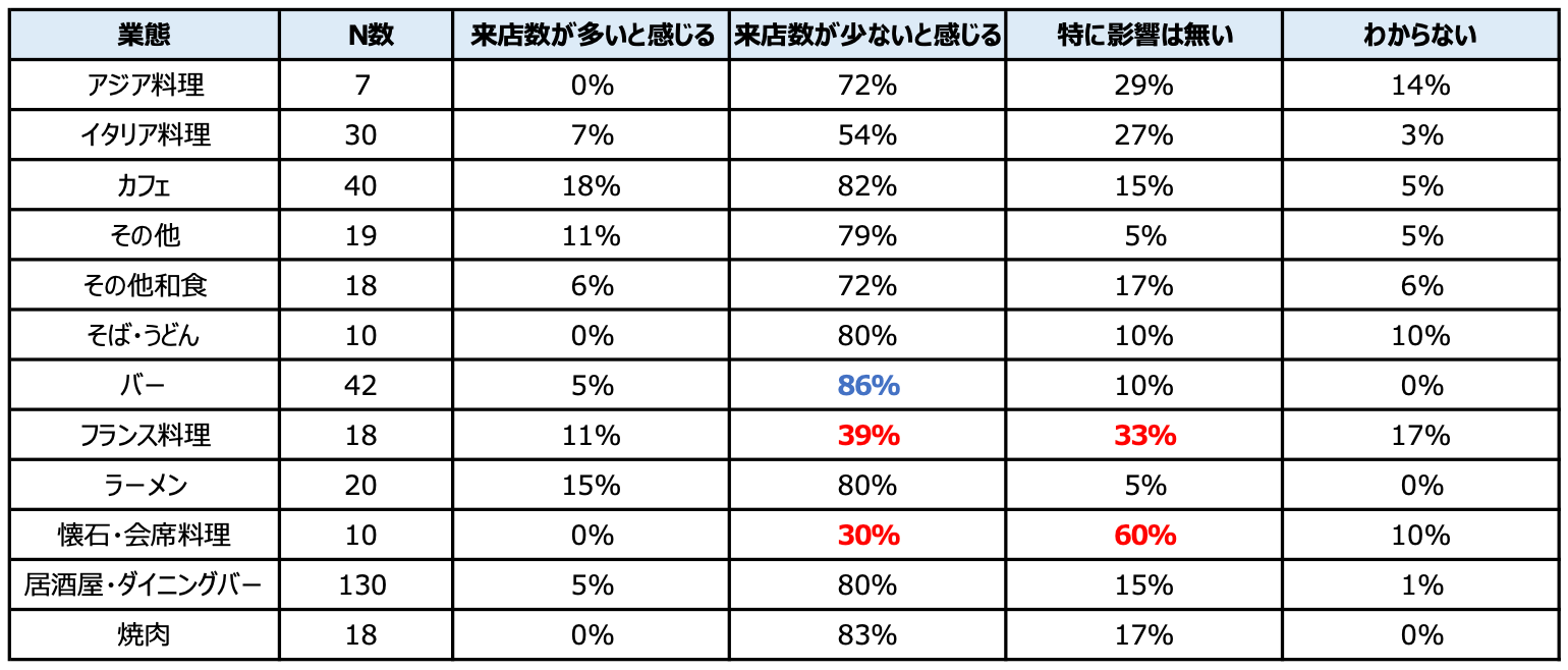 業態別では、「バー」が最も雨の日の来店数が少ないと感じており、「フランス料理」「懐石・会席料理」が30%台とあまり影響がないことがわかりました。