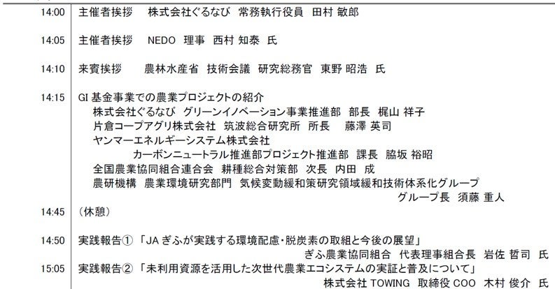 本セミナーでは、主催者である高機能バイオ炭コンソーシアム(ぐるなび:幹事社、全農、片倉コープアグリ、ヤンマーエネルギーシステム、農研機構)を代表し、ぐるなびの田村敏郎氏、国立研究開発法人新エネルギー・産業技術総合開発機構(以下、NEDO)の西村知泰理事の開会挨拶からスタート。田村敏郎氏は「生活に欠かすことのできない『食』を生み出す『農』や『地域』を未来につなげるための次なるアクション契機としたい」と挨拶しました。