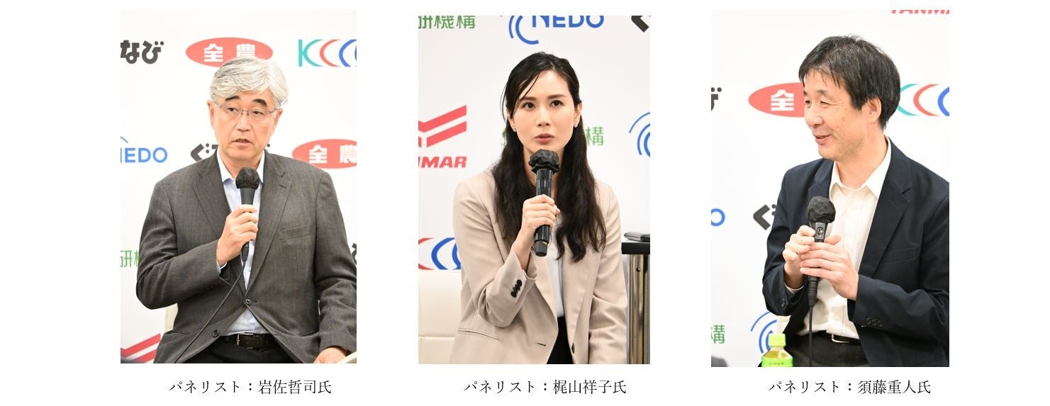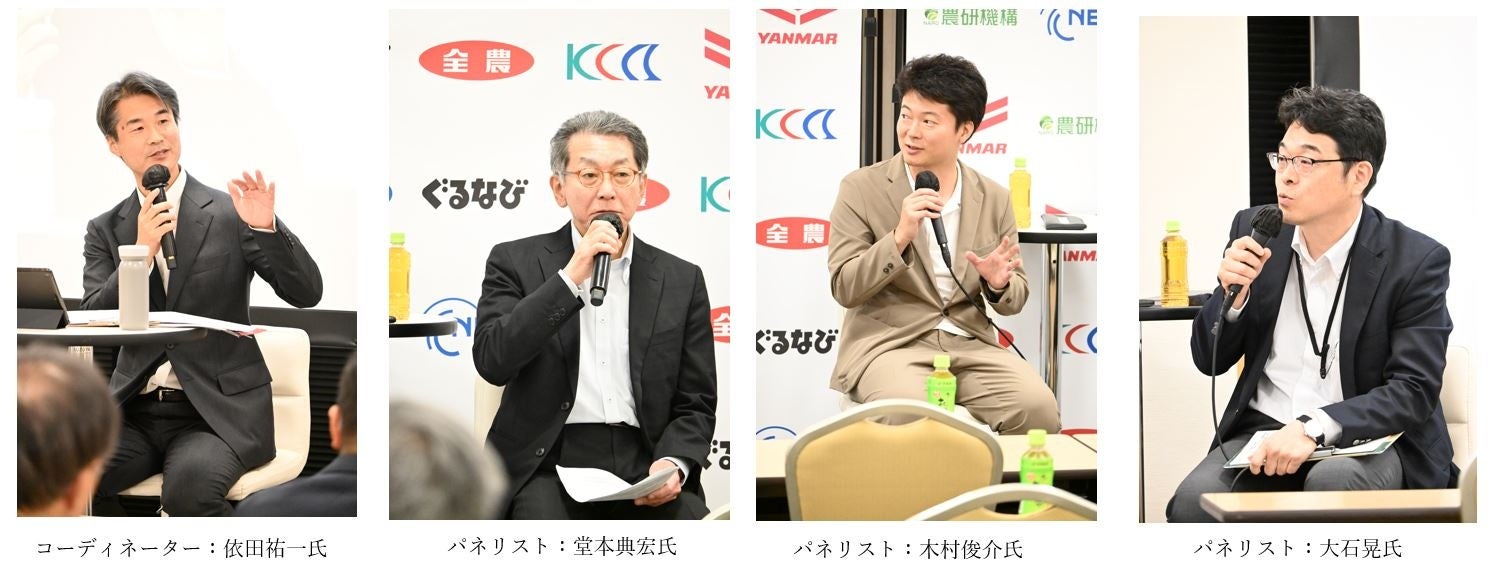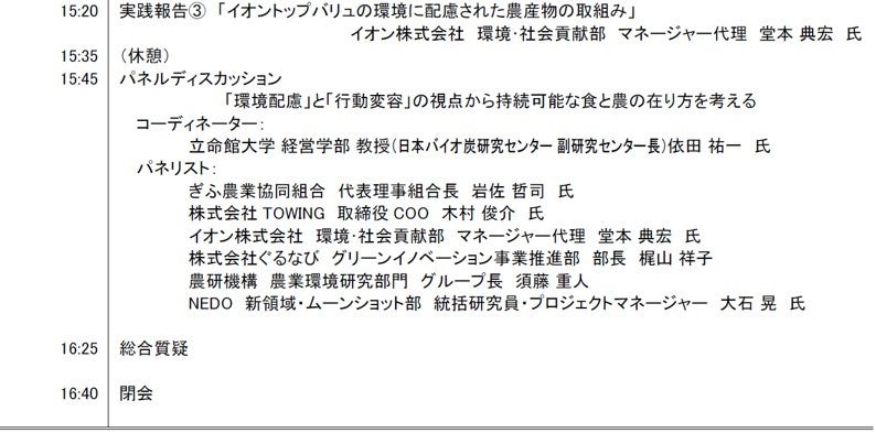 公開セミナーのメインとなるパネルディスカッションでは、立命館大学 経営学部・依田祐一教授がコーディネーターを務め、「環境配慮」と私たち消費者が取るべき「行動変容」の視点から持続可能な食と農の在り方を考えました。パネリストとして登壇したNEDO・大石晃統括研究員は、GI基金事業でのねらいと可能性について、「食料生産の過程で炭素貯留を達成していくことが大事。社会実装のためには、生産者にとって手間やコストが掛からず農法として受け入れられることが重要だ」と話しました。TOWING・木村俊介氏は、「単一の圃場でいかに生産量を上げるか、リスクの高い商材であるカーボンクレジットの創出に係るコスト負担」など、農業分野での環境配慮やJ-クレジット制度の課題への対応を紹介しました。イオン・堂本典宏氏は、「物語を紡ぐことをテーマにしている。どんな圃場で、どのような生産者がどのように栽培し、どのような思いで商品にしているか」を消費者に発信する取組事例を紹介し、消費者の行動変容を視野に入れたバリューチェーン全体での取り組みの重要性について指摘しました。総括として依田祐一氏は、「バイオ炭を通じた環境価値指標を作っていくことは学術的にも消費者の行動変容の観点からも興味深く、重要だ」と語り、環境配慮と行動変容の両立に期待を寄せました。